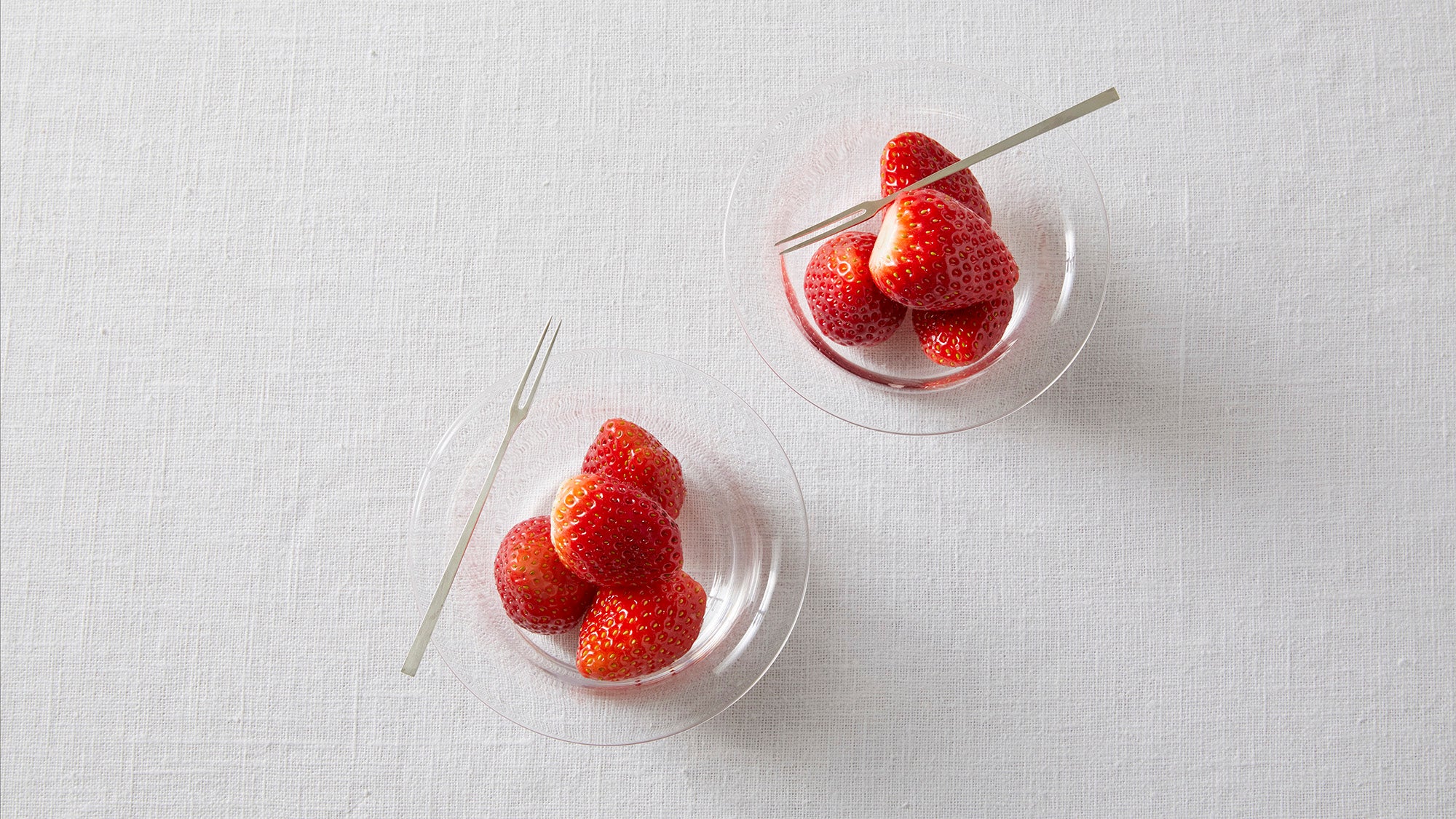 ガラスのボウルにいちごとフルーツフォーク。なんてことないおやつの時間でも、この3つの組み合わせで、どうしてこんなにかわいくなるのでしょう。きっと、フルーツフォーク自体に丸みがあったりしたら、生まれていなかったかわいさです。