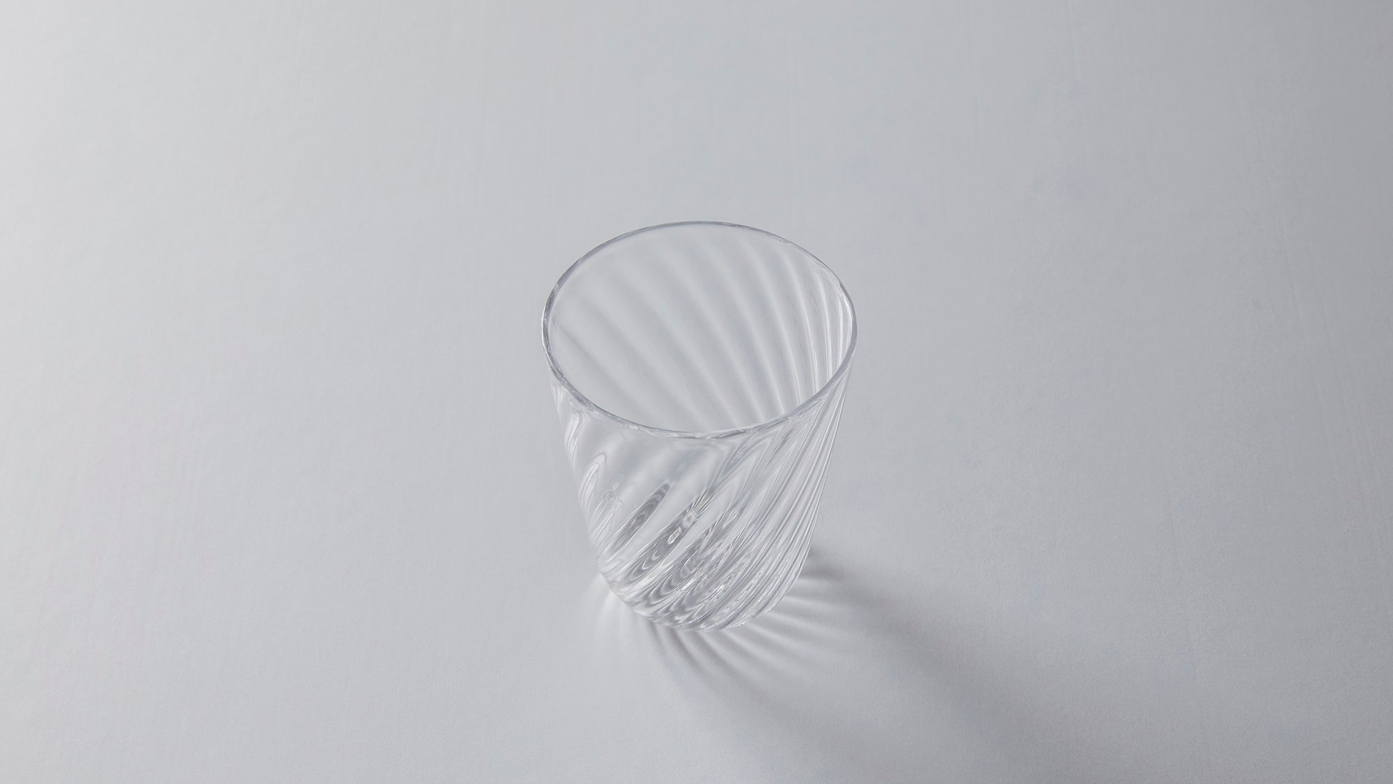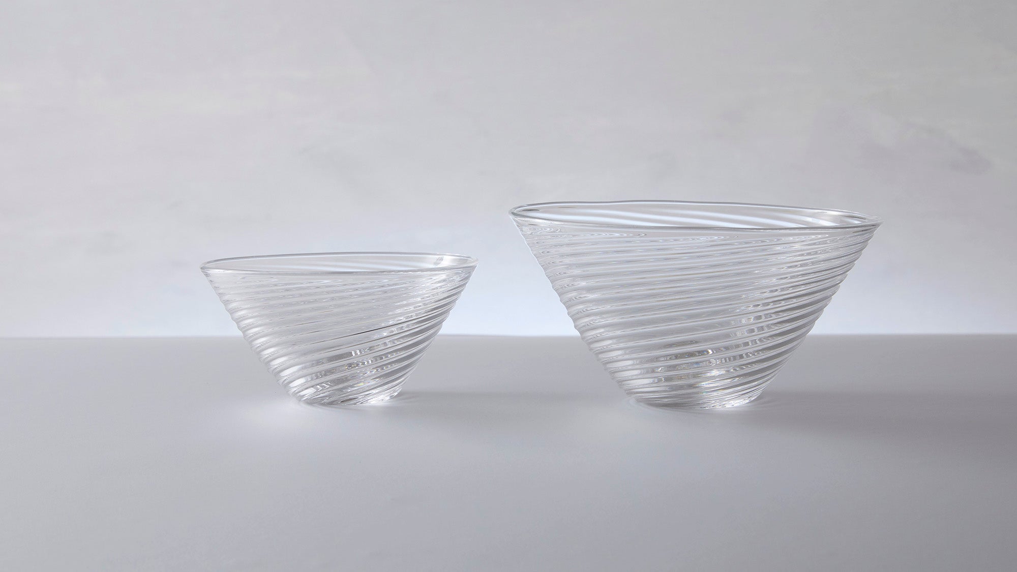 「宙吹き」で形成される髙橋さんのガラス作品は、ひとつとして全く同じ形のものはありません。ぐるぐる模様こそ型で作られますが、型にはめた後も細かい調整が行われるため、模様の出方も異なるのです。