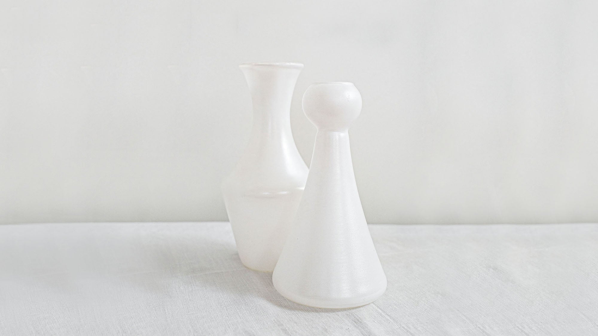 YOKIのフラワーベースは2種類。今回は「04」と「12」をセレクトしました。どちらもパールがかった乳白色で、見ていて飽きの来ない風合い。また、フロスト加工で仕上げているため、指紋が目立ちにいのも嬉しいポイントです。