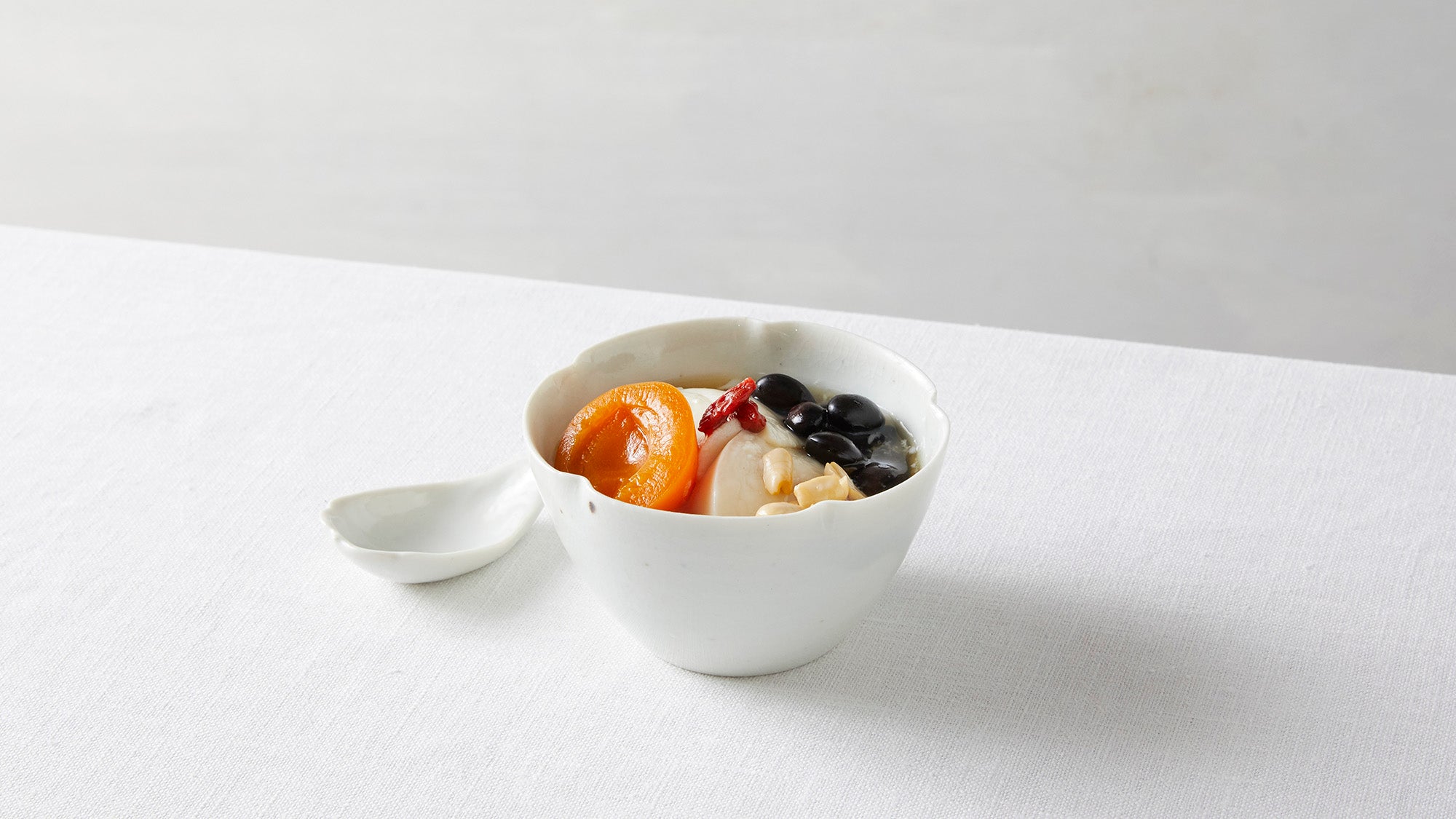 実際に豆花を盛り付けてもらいました。うーん、美味しそう。料理が映えるつややかな白磁が色々な使い方を想像させてくれます。オーツとヨーグルトとアサイーで朝ごはんにもぴったりなサイズです。