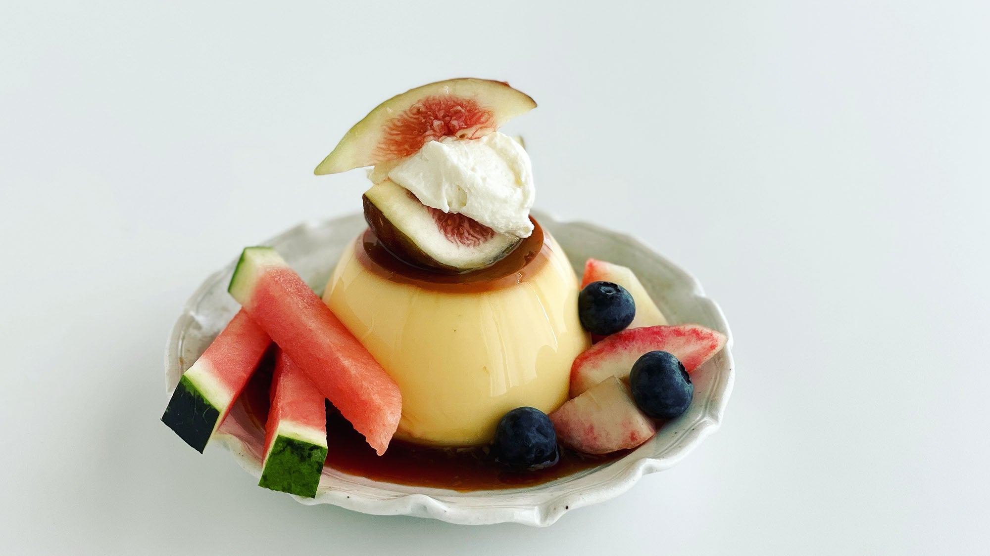 プリンにマスカルポーネをのせて、夏の果物をプリンアラモード風に盛り付けました。すいかにいちじく、桃、ブルーべリー等と国産果物をあしらうなら、磁器のお皿が似合います。