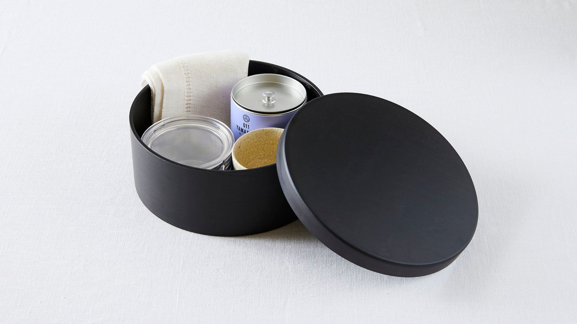 おひつと言いながらもスタイリッシュでミニマルな装い。煎茶堂東京の茶缶や透明急須を入れて、さっと出せるようにお茶道具入れるのも◎。