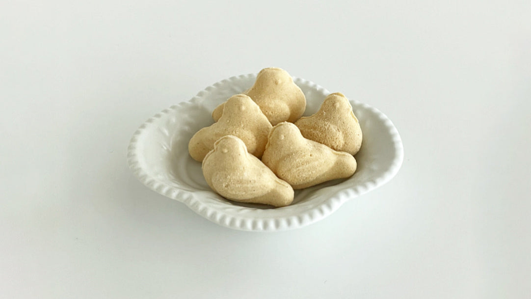 この器に鎌倉「豊島屋」の銘菓「小鳩豆楽(こばとまめらく)」を盛り付けてみました。可愛すぎて食べられません(食べますけど)。