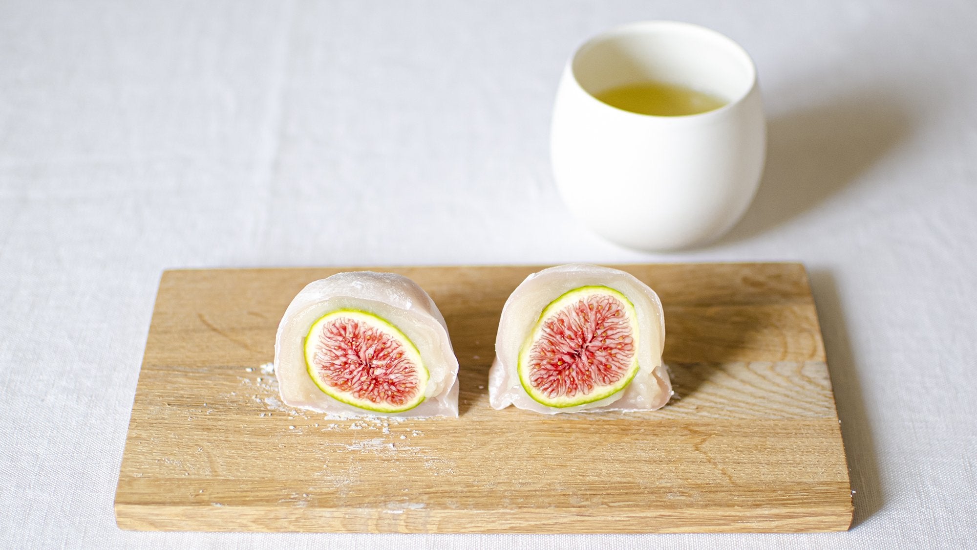 いちじく大福に合わせるのはフレッシュなハーブのような香りが人気のある「002 香駿」。いちじく大福にガブっとかじりついて、いちじくの果実と白餡のほんのりした甘さを味わったら、「002 香駿」の一煎目をひとくち。鼻を抜ける香りを存分に楽しみます。二煎目は一煎目に比べてすっきりした味わいの一杯となるので、いちじく大福を最後までおいしく味わえるのが嬉しいですね。