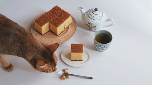 お菓子とお茶(と猫)|DE CARNERO CASTE「プレーンカステラ」と「棒ほうじ」