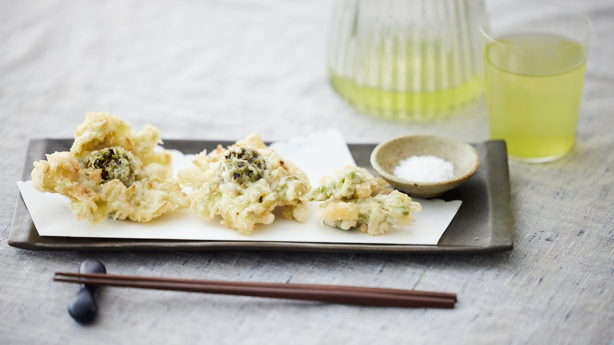 揚げたてサクサクを塩でいただく天ぷらと、旨みとともに甘みを感じられるよう、低温で淹れてから急冷にしたお茶の組み合わせは上品でありつつも、手が止まらないほどの美味しさなのです。
