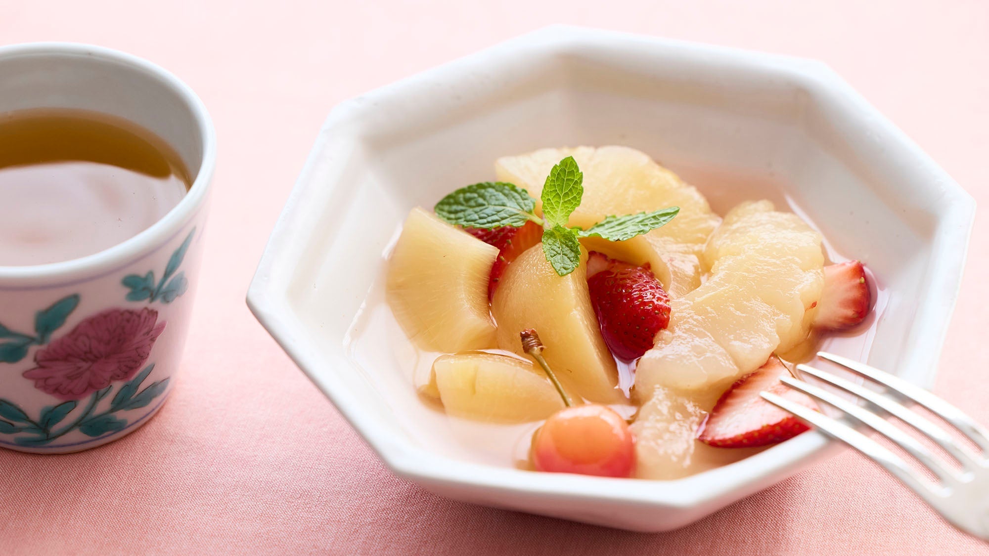 たっぷりのフルーツをシロップに漬けたフルーツポンチと合わせたら、ちょっと贅沢なおもてなしの一席に。