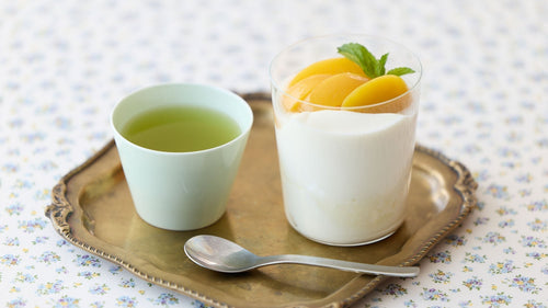 香りを楽しむ夏レシピ。桃のコンポートを添えたミルクプリンと「001 はるもえぎ」