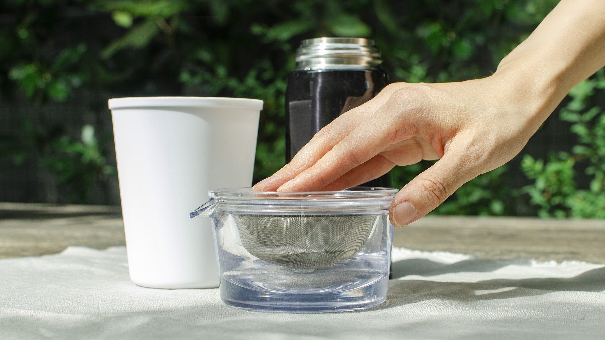 野点に持っていくのは、透明急須、その日の気分で選ぶ、ちょうど1回分のお茶が淹れられるお試しパックの茶葉、お湯の入った水筒と、お茶を飲むための器。