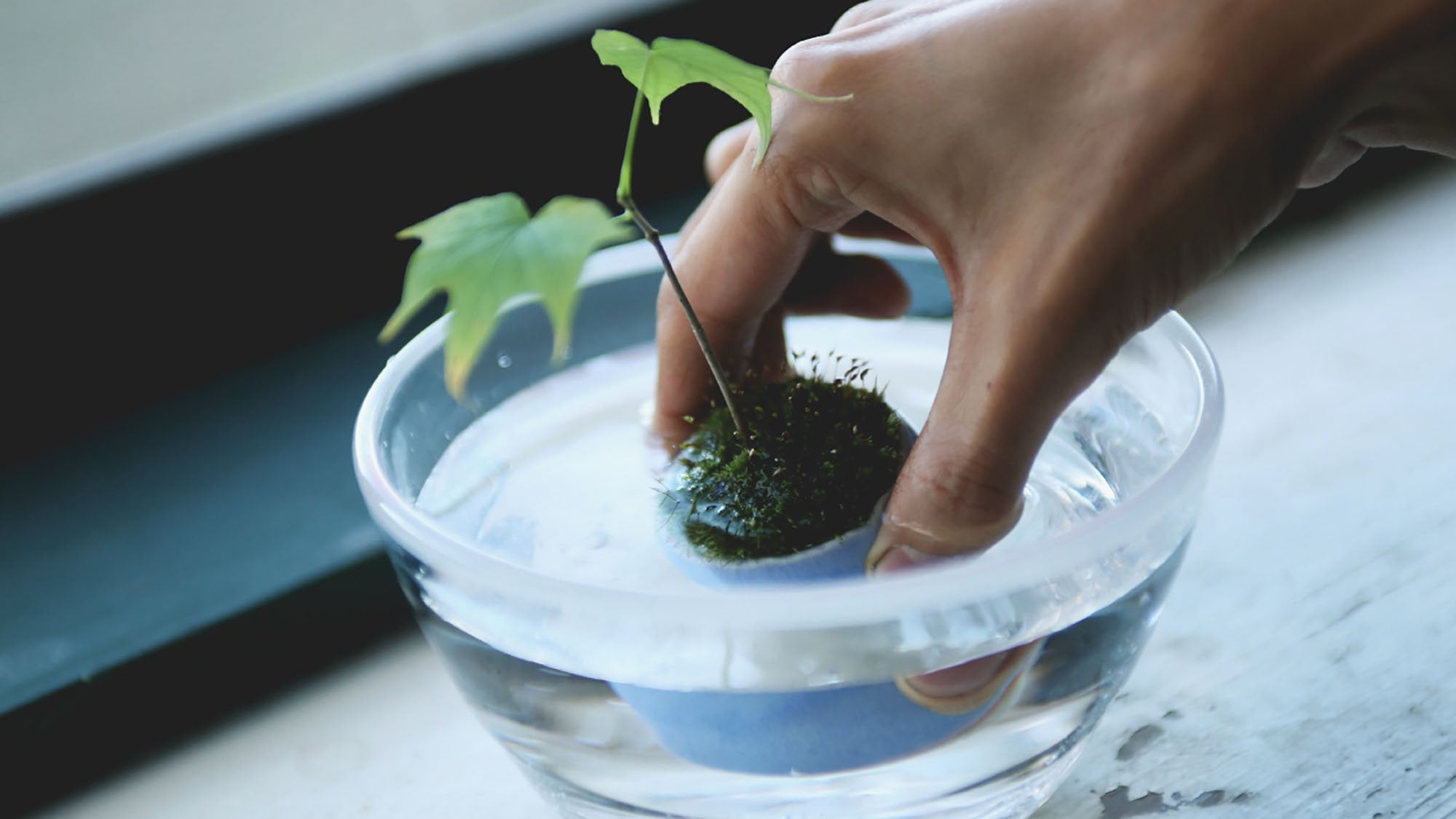 小さい鉢は水やりの際にムラが出やすいので、鉢全体を水に浸けます。気泡が出なくなればOK。夏は1日に1回、冬は2〜3日に1回が基本。水をあげるときは、ハンドクリームがついていたり容器に洗剤が残っていたりすると植物や苔の致命傷になってしまうので注意します。また、水道水のカルキで苔が変色することがあるので、汲み置きしてカルキ抜きをするのがおすすめ。