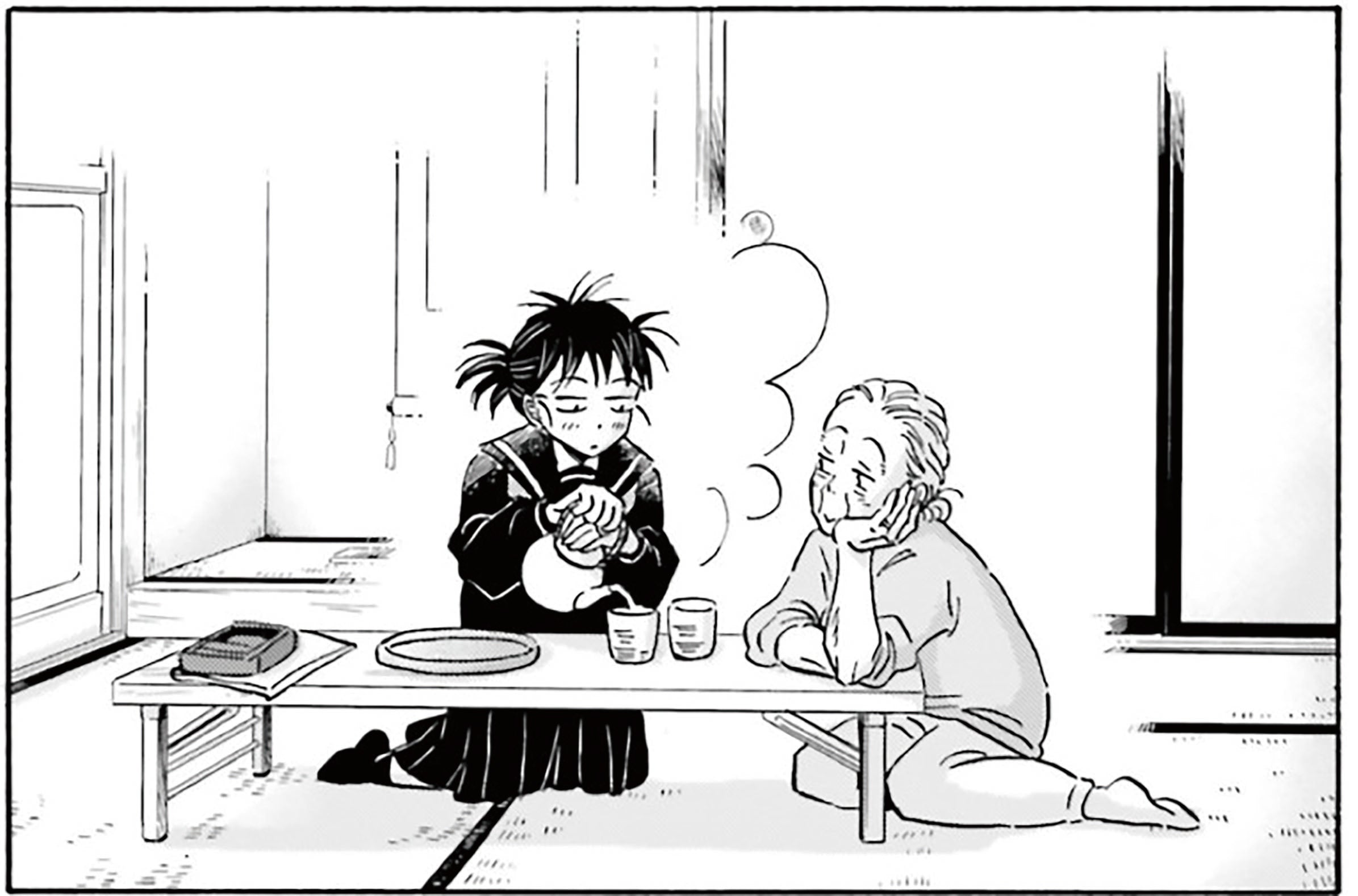 友だちのいない、うららという女の子と、歳をとって連れ合いを亡くし一人暮らしになった雪さんという女性が、BL漫画を通して友だちになるお話で、二人の間にはいつもお茶があります。喫茶店に行ったり、家に遊びに行ったらお茶を出してもらったり。