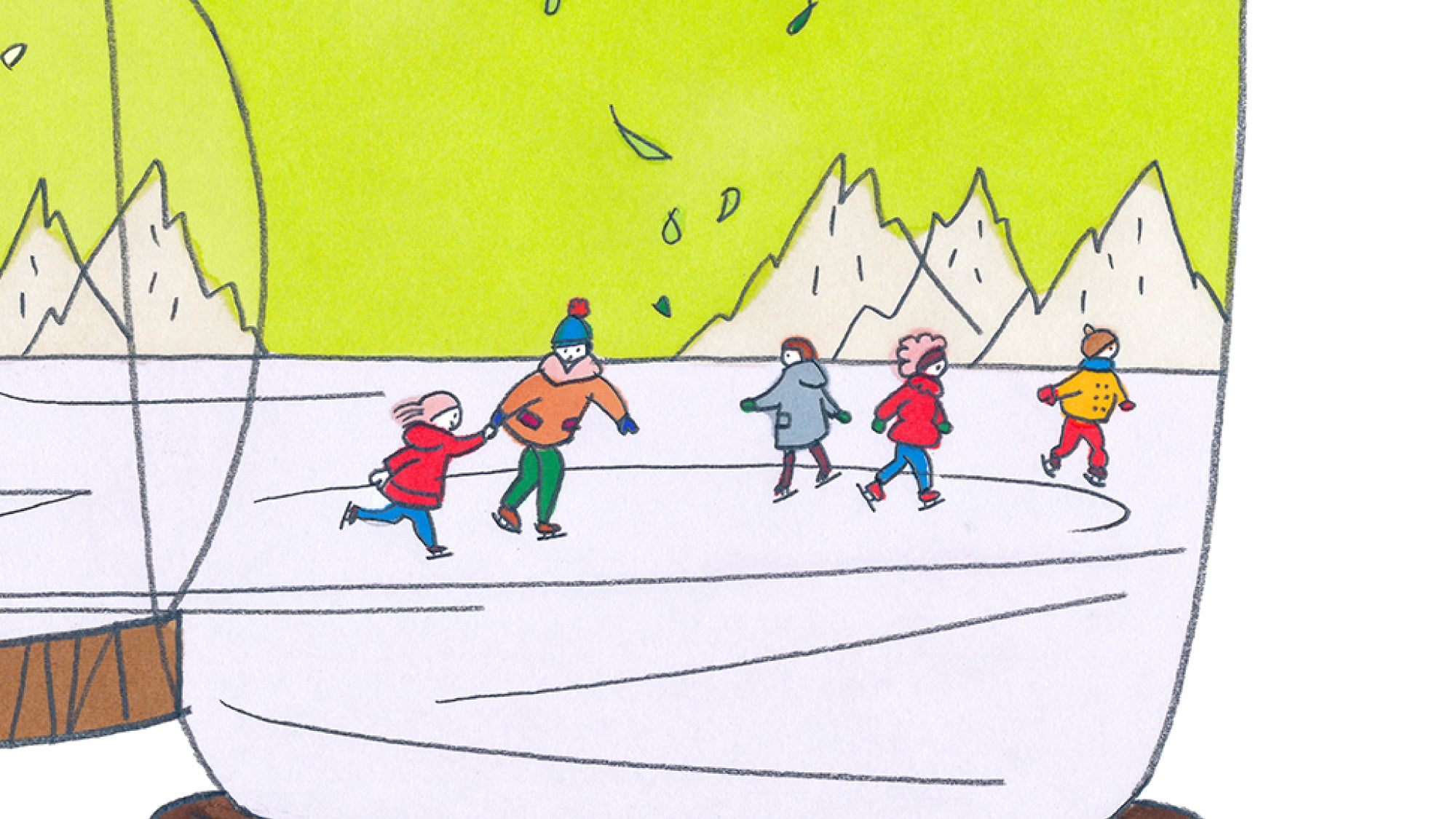 緑色の空の下でスケートをする人々。茶葉が舞うグラスの中は、お茶の世界? なんともファンタジックな風景です。