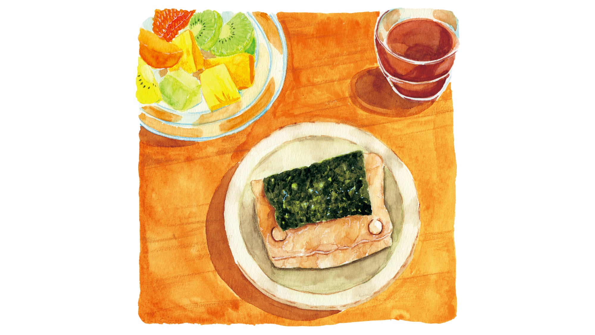世界中の献立を食べるといっても過言ではない、 多彩な日本の食卓の中で、ひょんなことからパン屋を始めて20年になるが、 当然朝食はパン……ではなく、米もちが最近のお気に入り。 パン好きの多さに感謝しながらも、もっとお米を食べようよと思わずにいられない今日この頃。 フルーツたっぷりにいつものお茶、香ばしく焼けた玄米餅にノリを巻いて、いただきます。