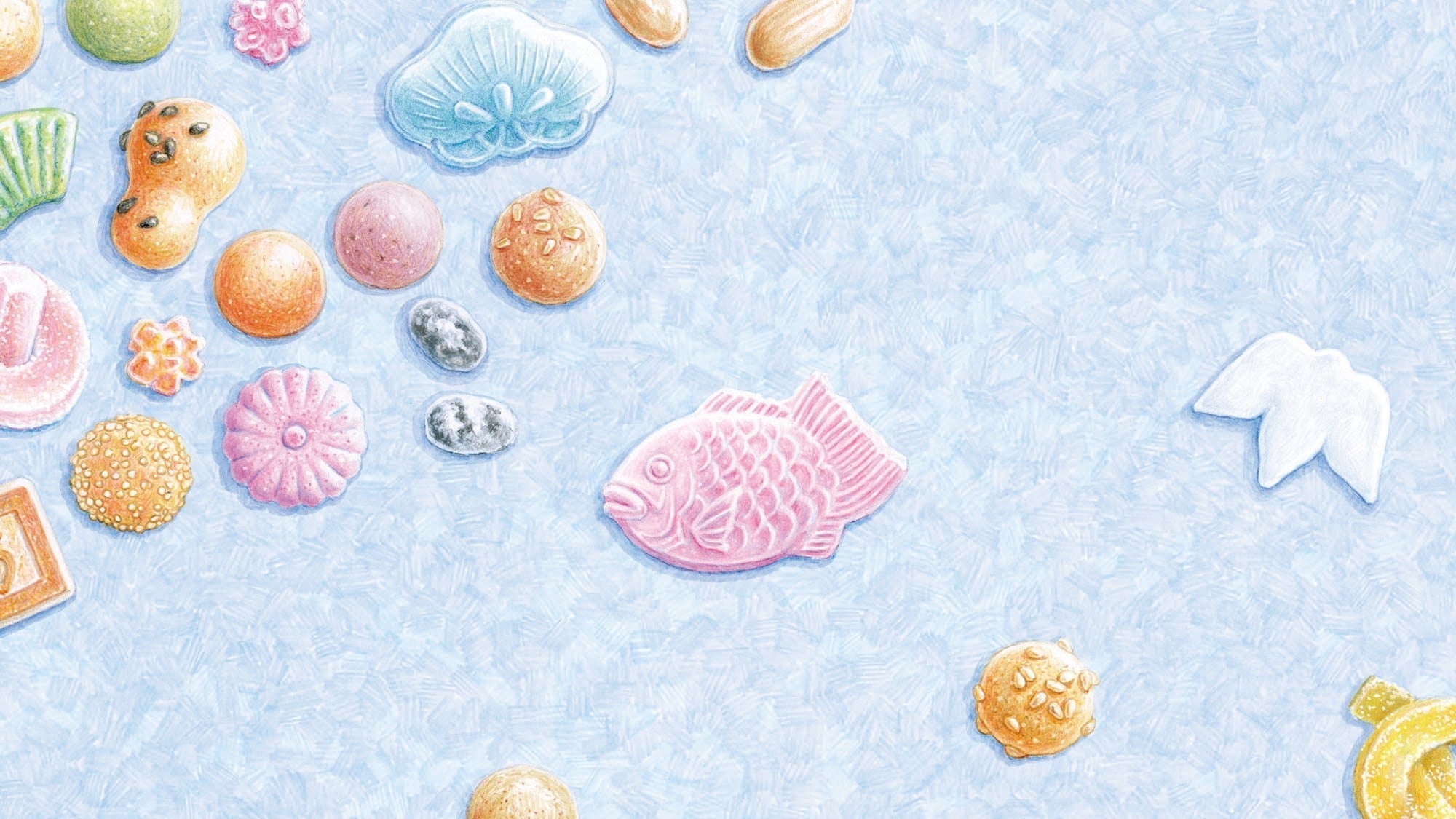 さて、一月はおめでたいモチーフが集まった吹き寄せです。表紙の至る所にハレの象徴が散らばった、新年を祝う表紙になりました。ひとつの箱に色々たくさん入って、まるでおやつのおせちのようですね。