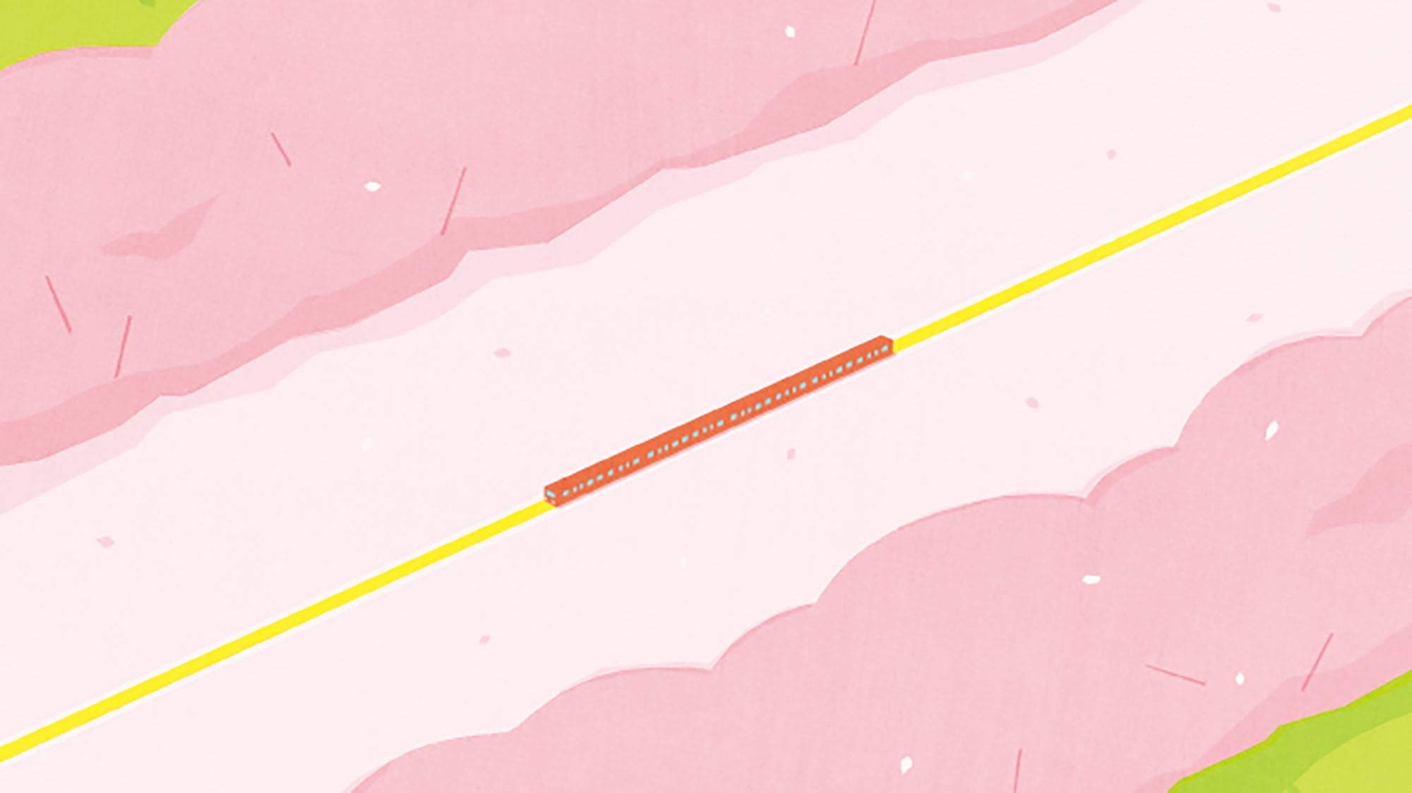 ピンク色に染まった谷の中、元気いっぱいな黄色の線路の上を走る列車──。
