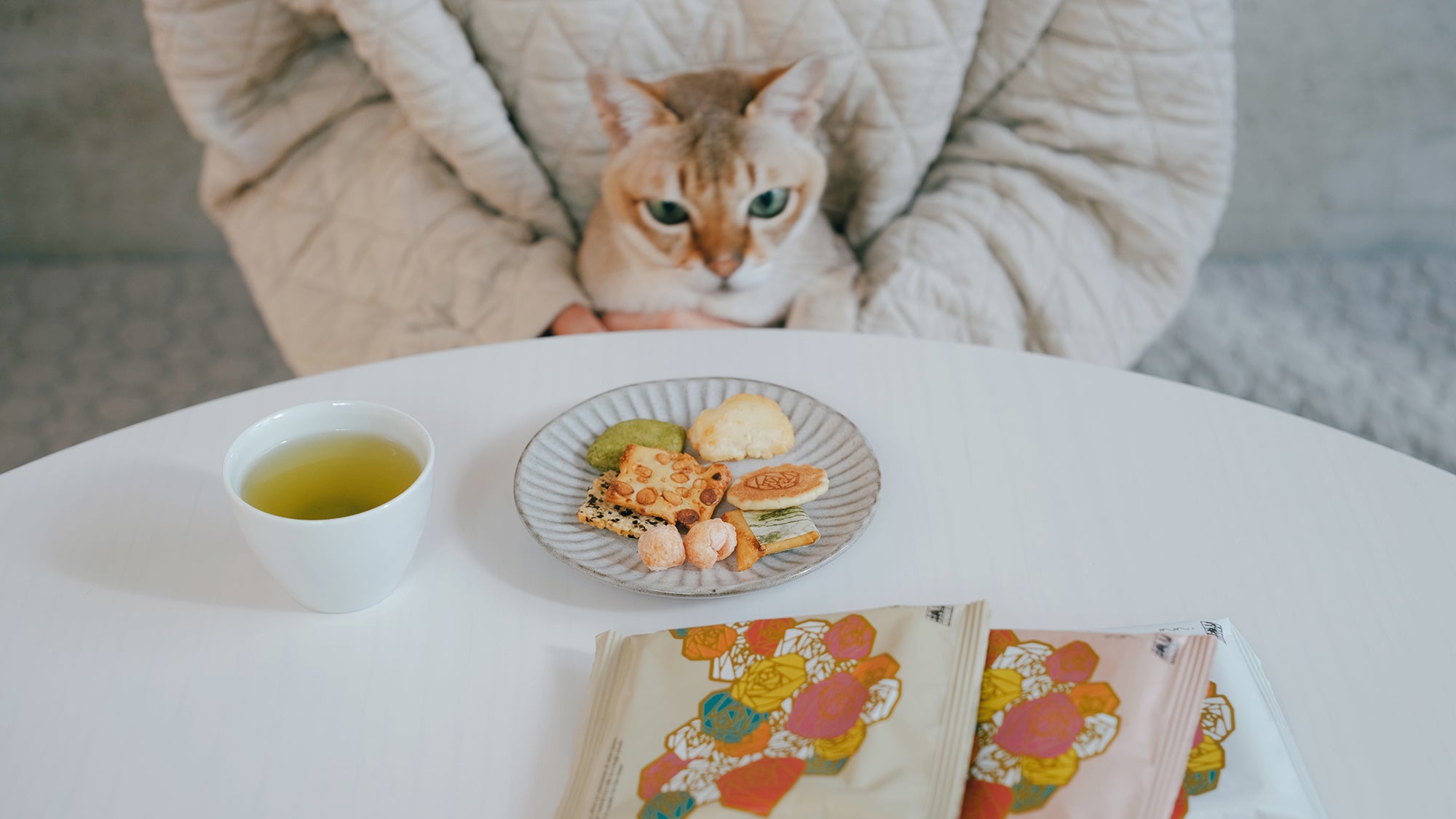 お菓子とお茶(と猫)|こたつと、お茶と、おかきがあれば。赤坂柿山「ななこ」と「045 おくみどり 霧島」
