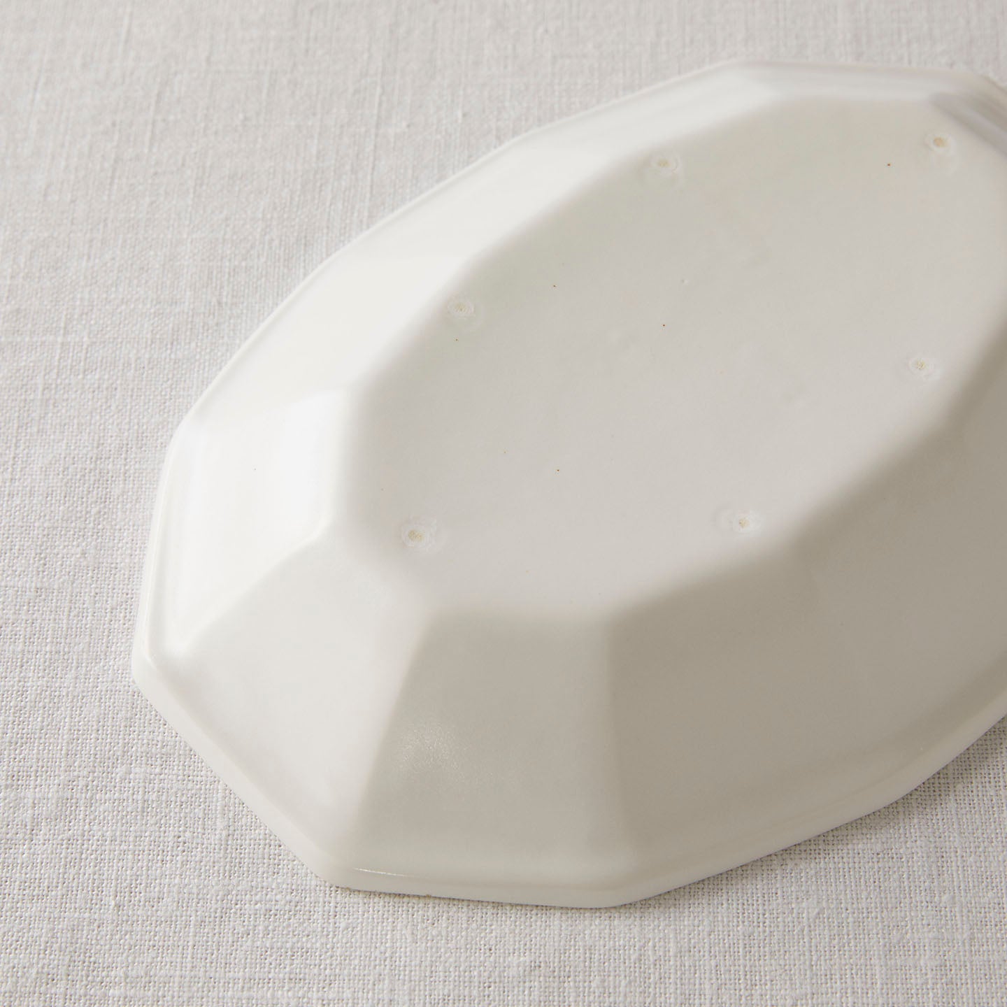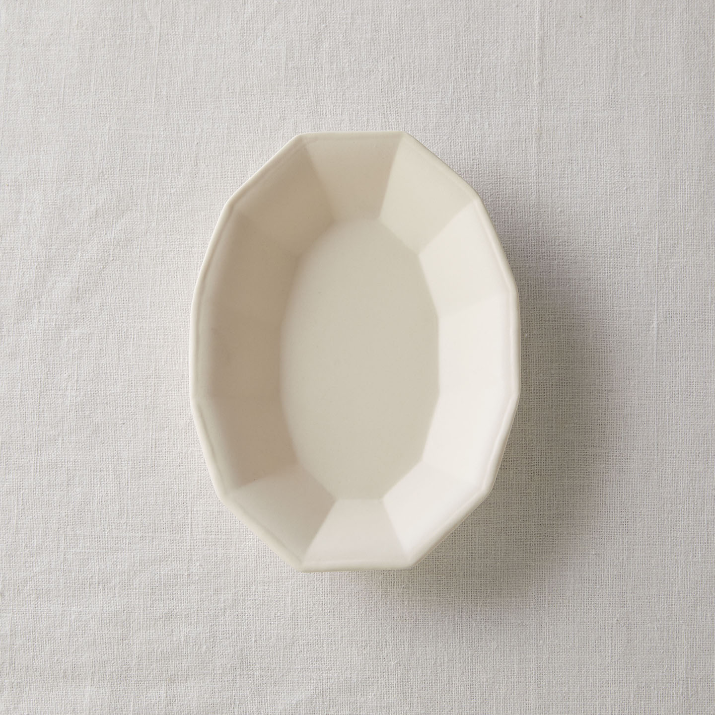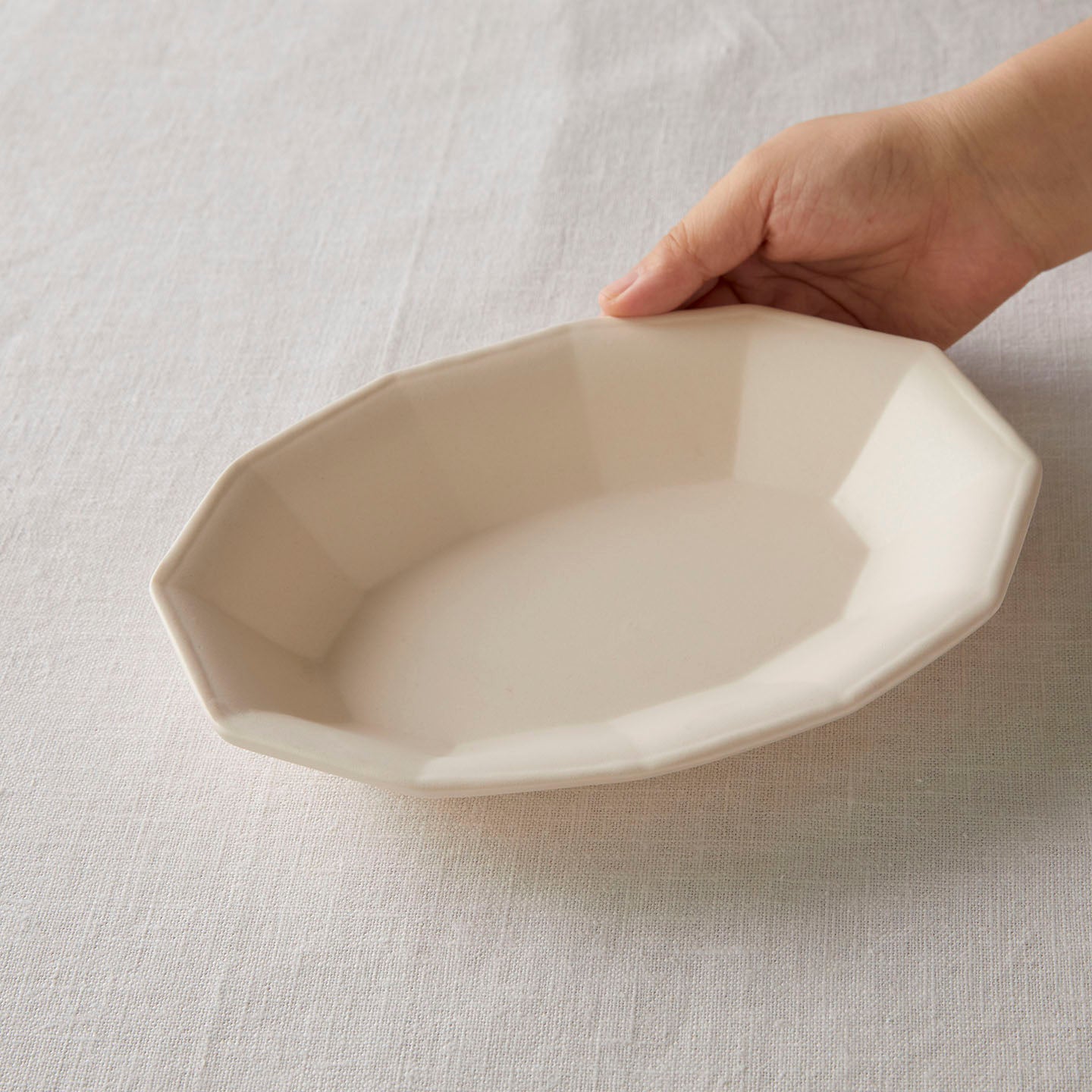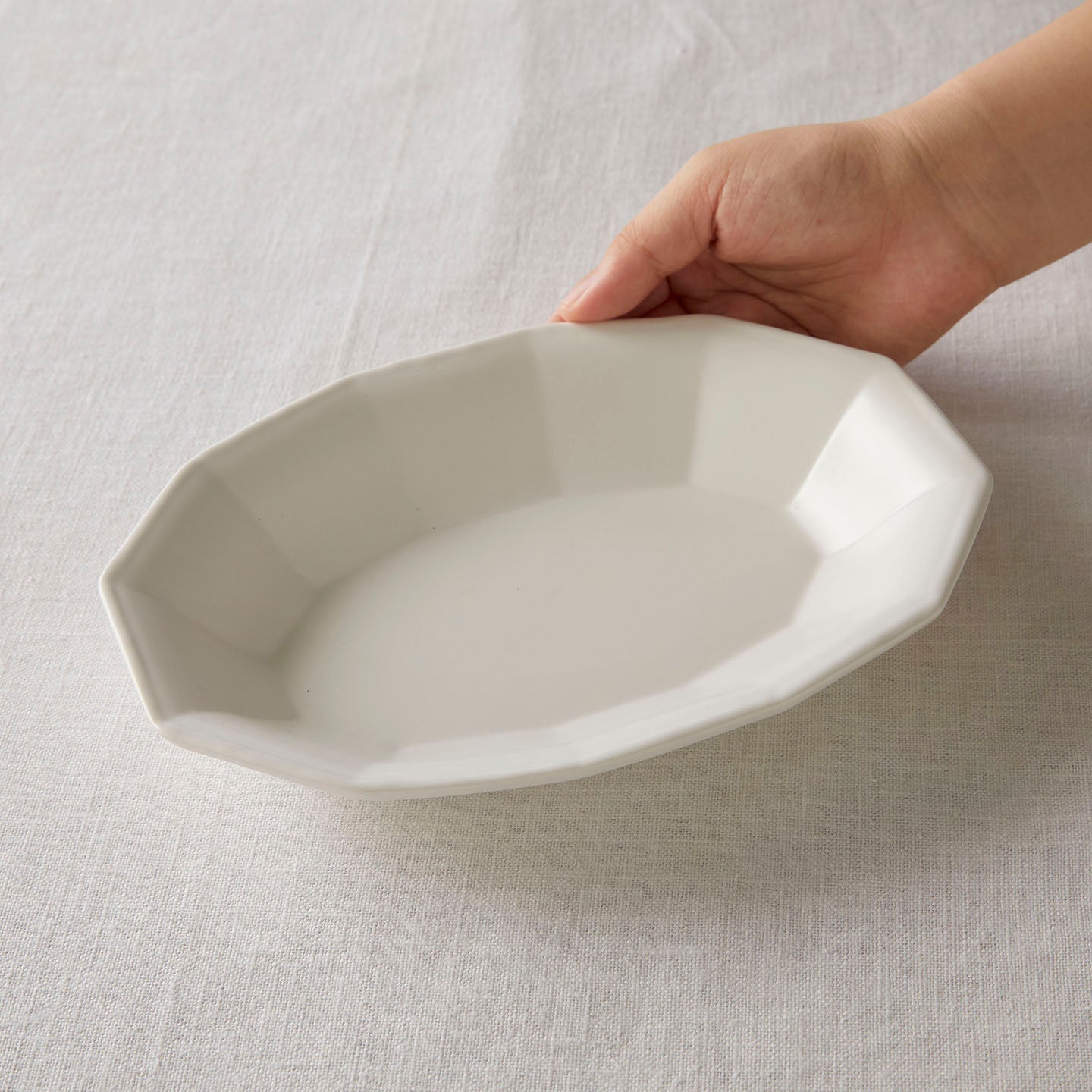 「白釉オーバル面取鉢」は、ゆったりした線の器が多い亀田文さんの作品の中で、規則的な面の取り方が特徴のうつわ。