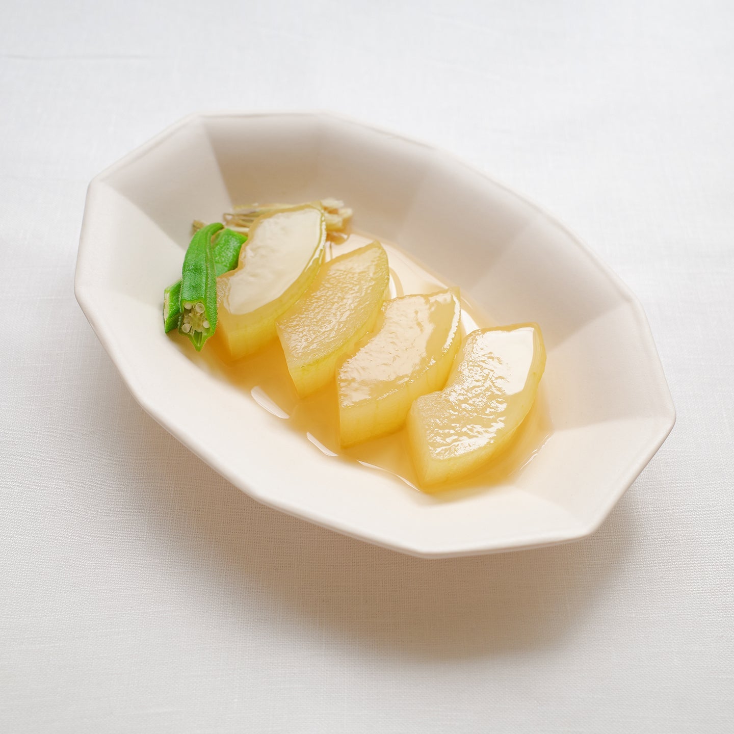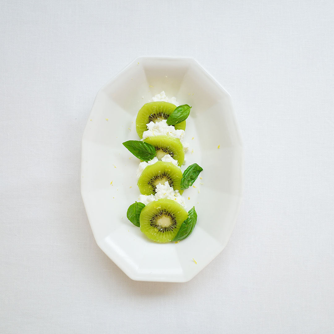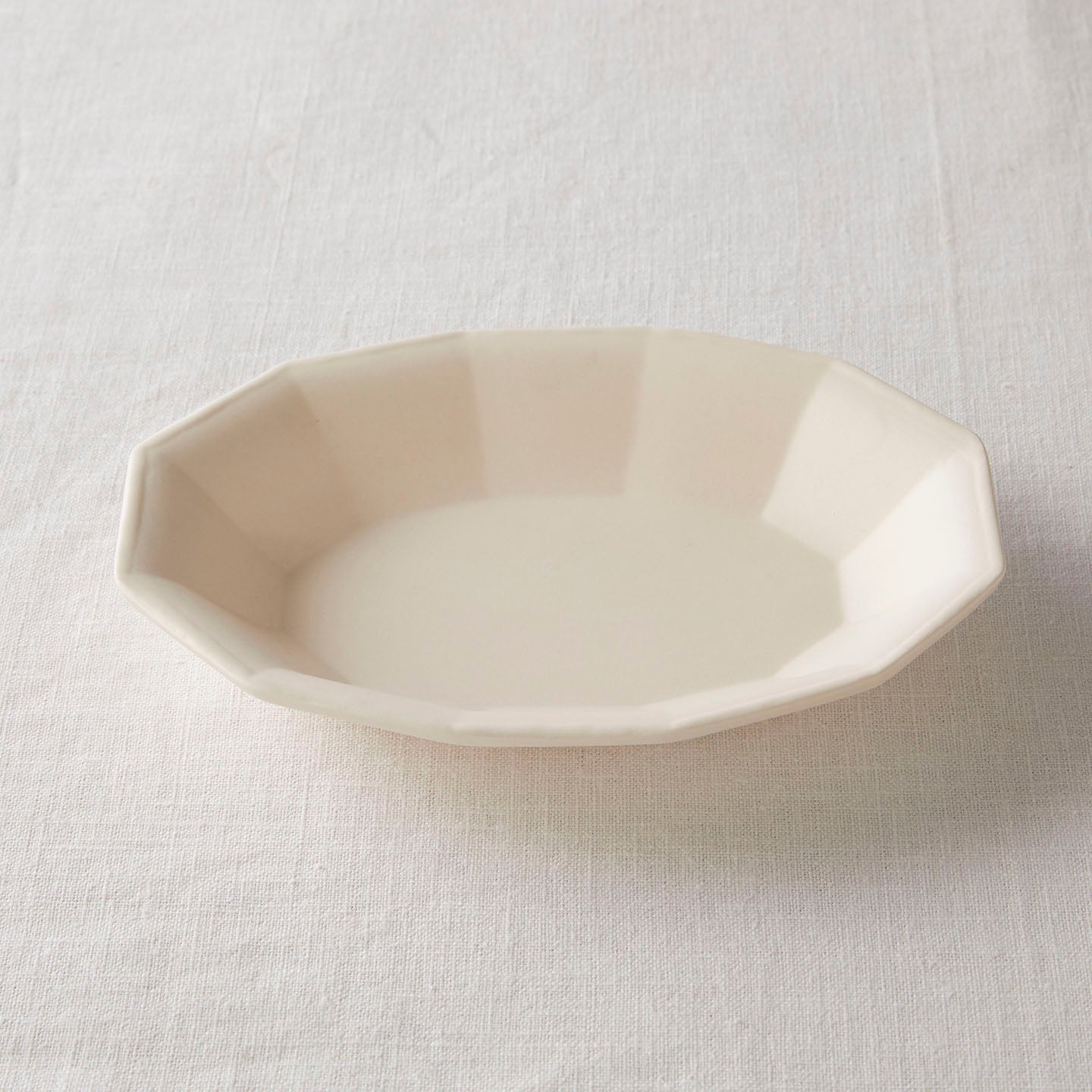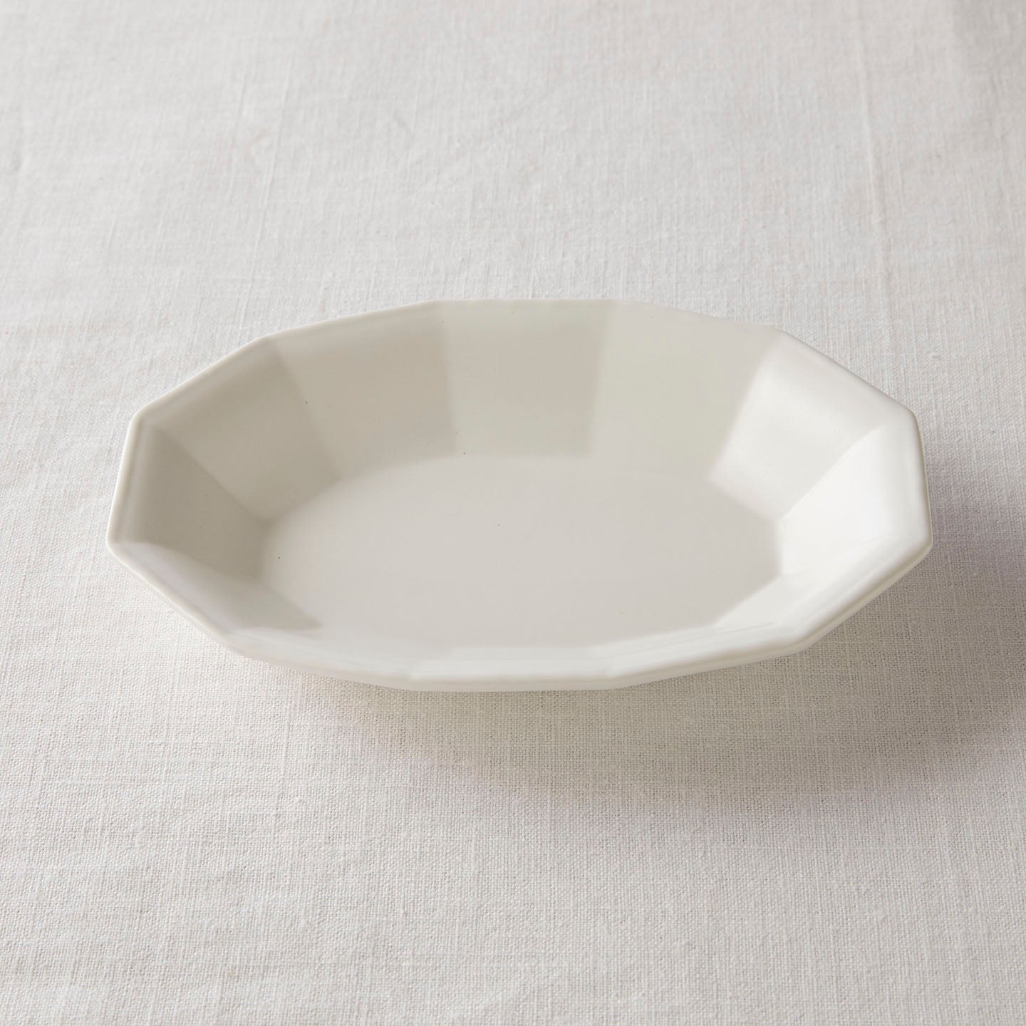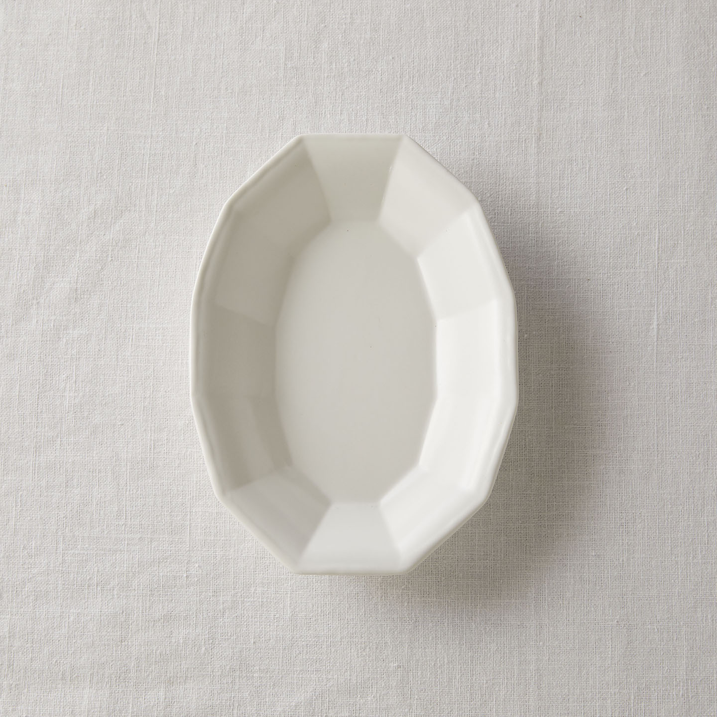 「白釉オーバル面取鉢」は、ゆったりした線の器が多い亀田文さんの作品の中で、規則的な面の取り方が特徴のうつわ。