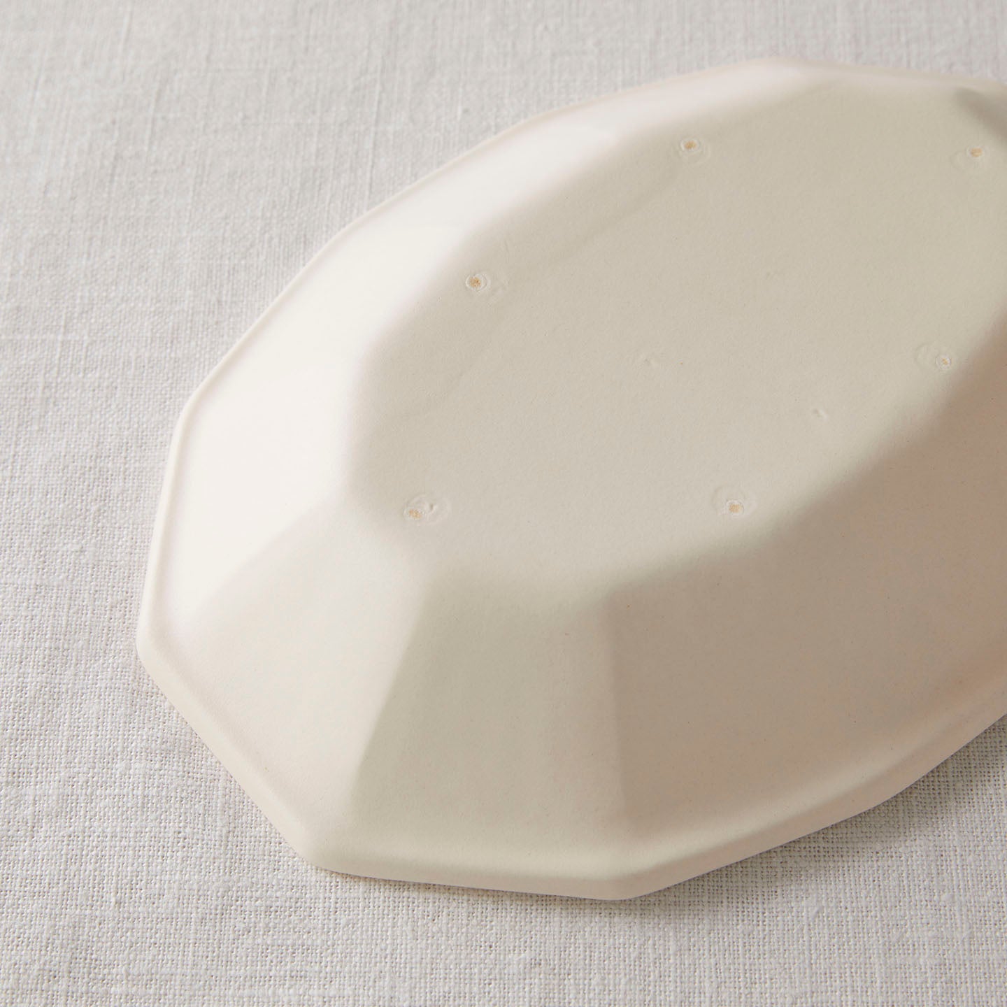 この「オーバル面取鉢」は、亀田文さんの手によって一枚一枚丁寧に焼かれています。裏をひっくり返すと、「目跡(めあと)」と呼ばれるものが見られます。