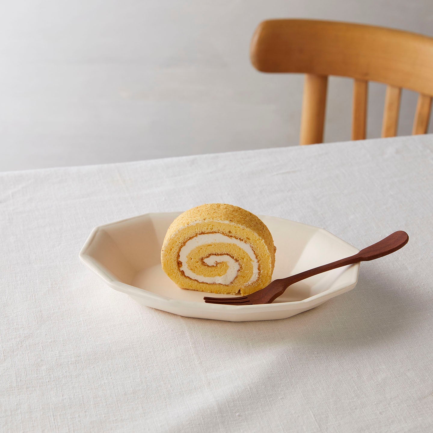 優しいさくらベージュは、3時のおやつに使いたい。クリームとふわふわスポンジのロールケーキ、紅茶で憩いの時間を。幅約23cmの大きめのお皿ですが、そのサイズ感をフルで使い切る必要はありません。