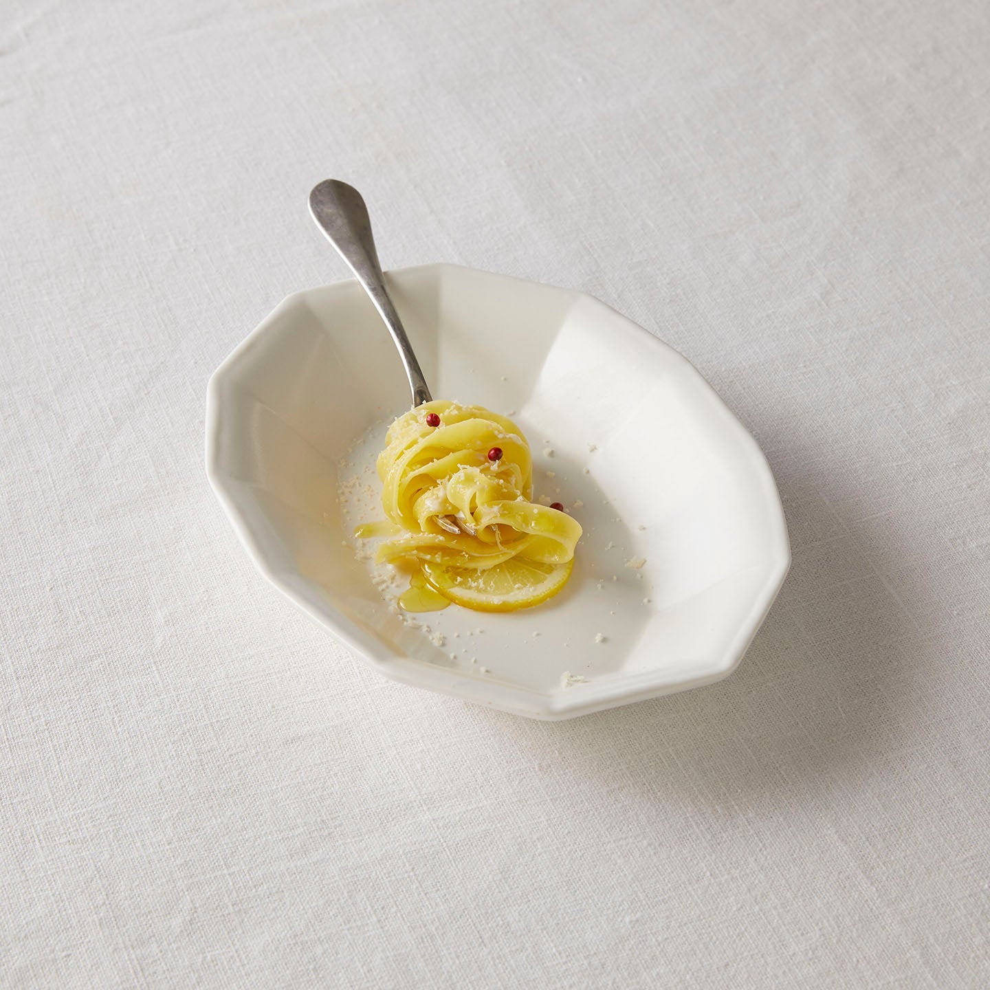 レモンクリームパスタで一品。真っ白で凛とした白ながら、まろやかな印象があるのはやはりこのうつわに潜むディテールがそう感じさせてくれるのでしょうか。