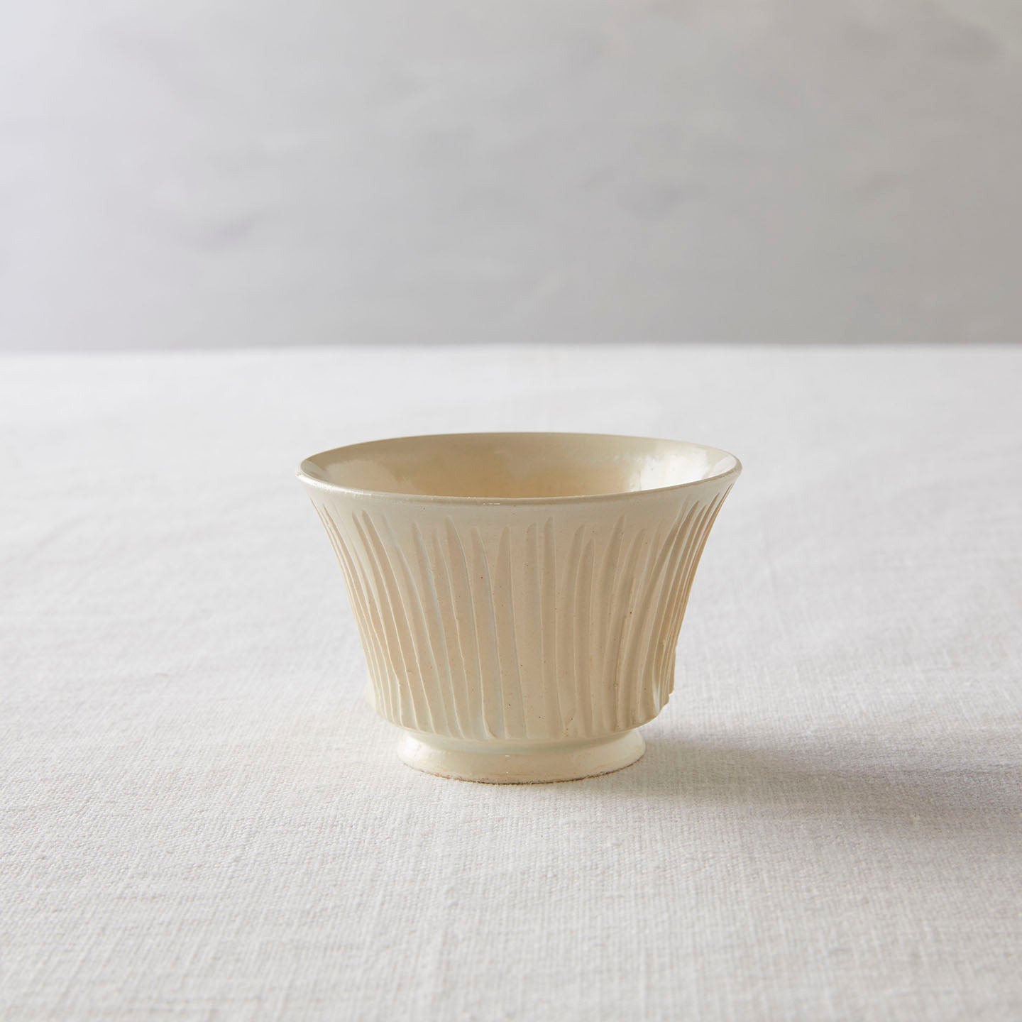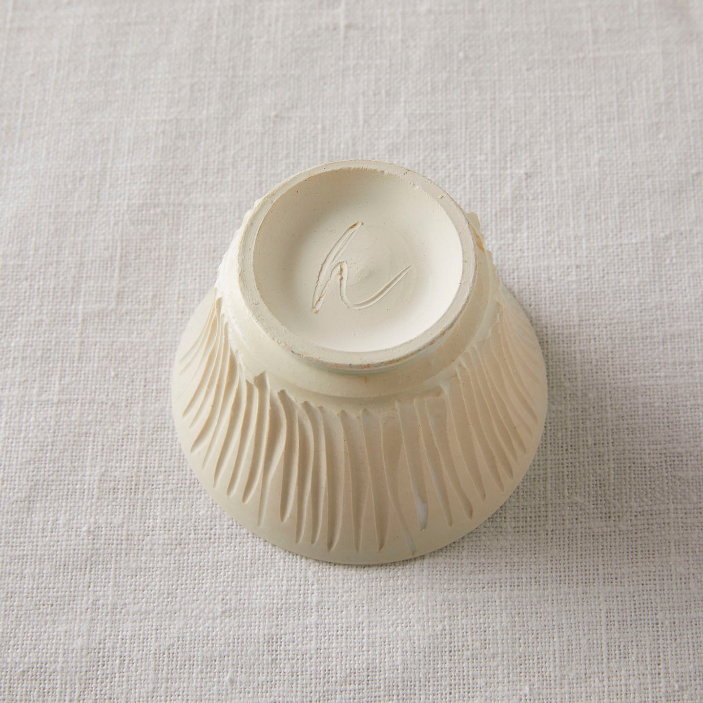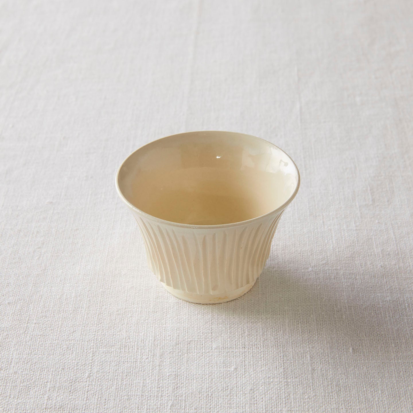 飲み口が広がった小さいカップ。中里さんが一本一本、全体のバランスを見ながら入れている刻線がアクセントになった「しのぎカップ」は、綺麗な曲線を描いたアウトラインと手仕事の痕跡が同居した一品です。