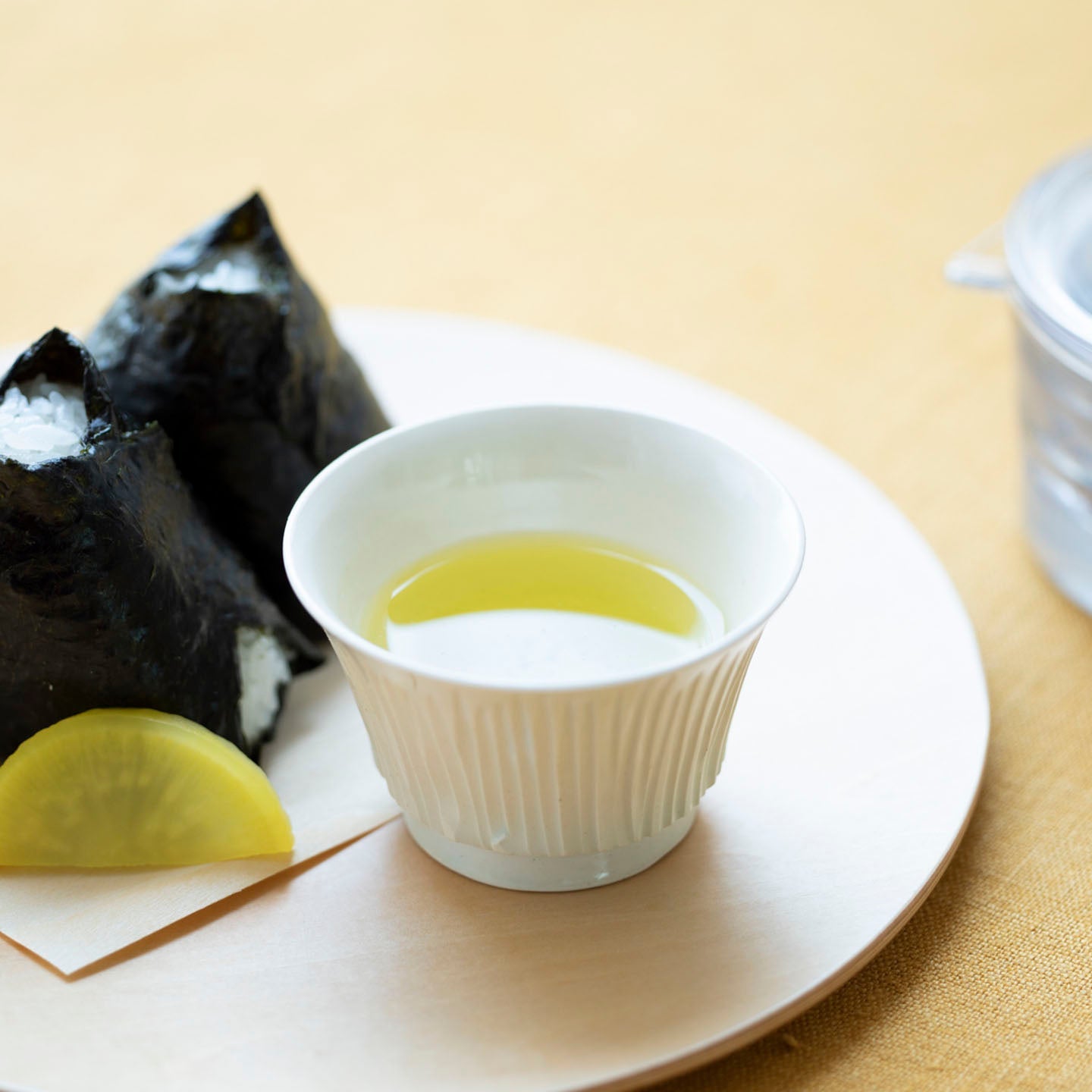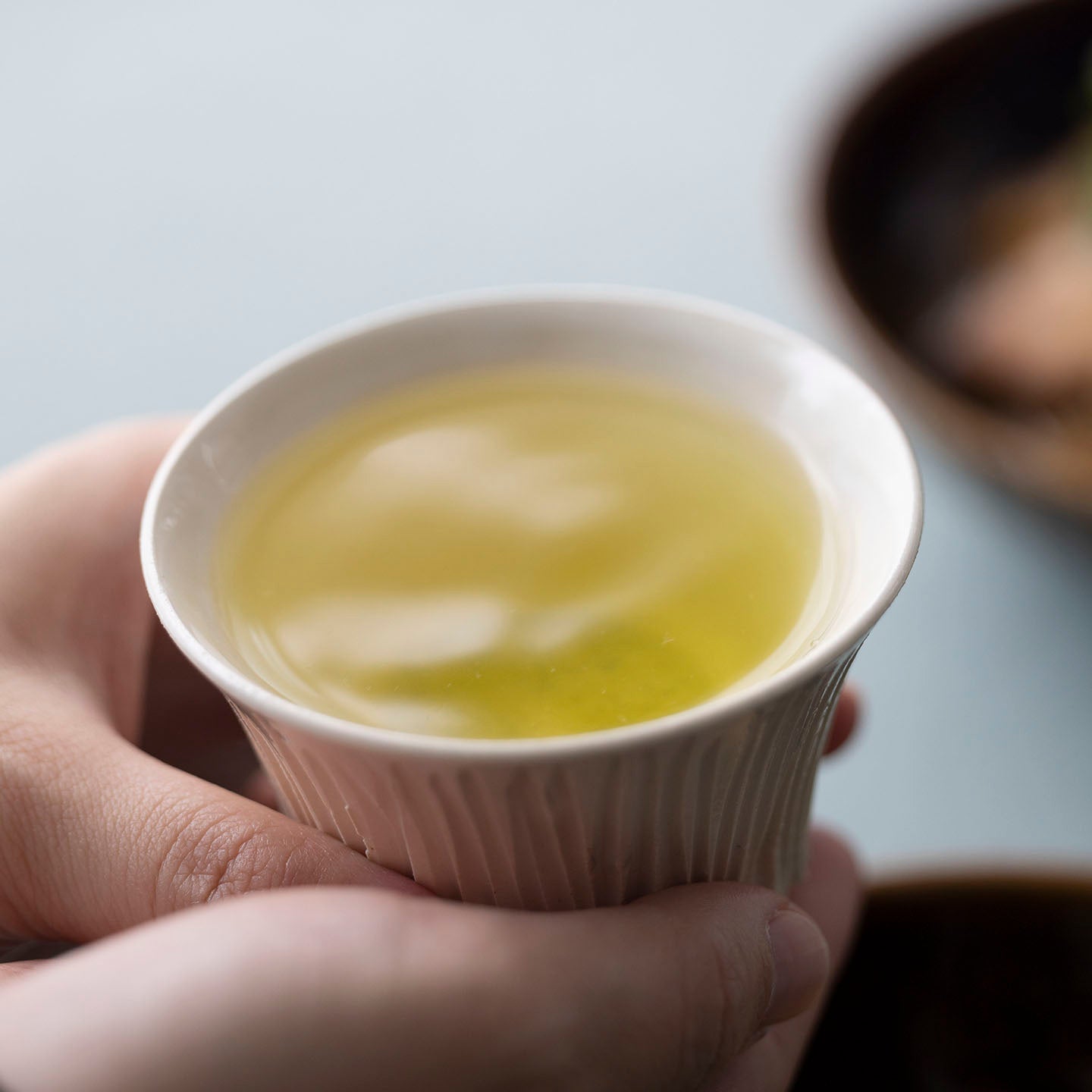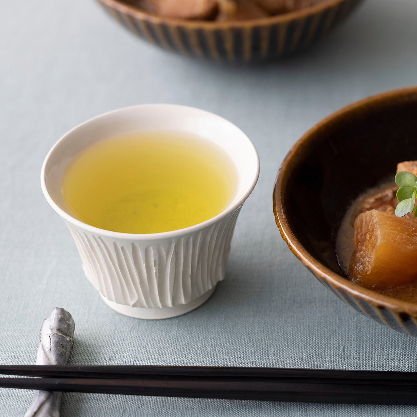 緑が綺麗に映えるしのぎカップ。やっぱり、緑が濃く出る深蒸し茶を選んでしまう。『027 CA278』のような濃厚な味わいのお茶を合わせてみてください。