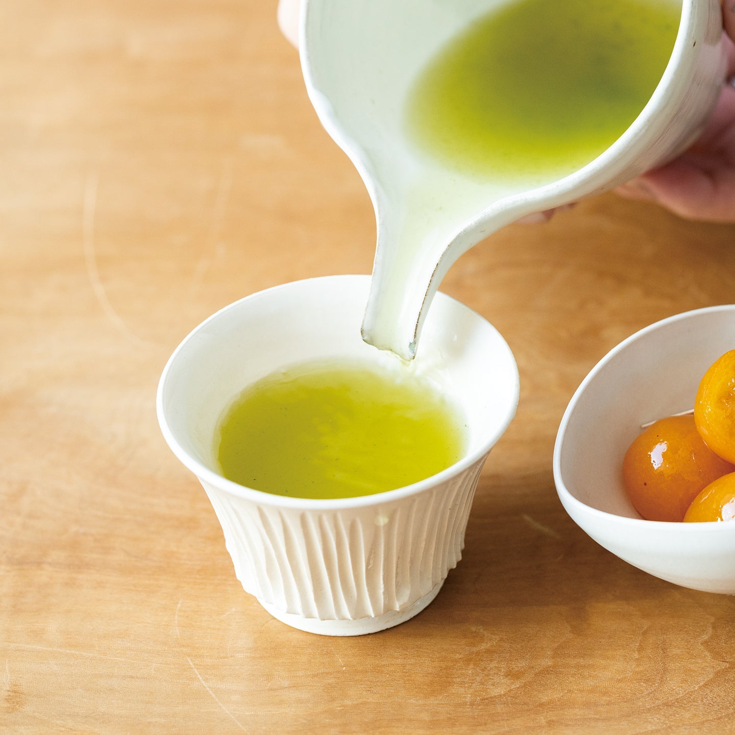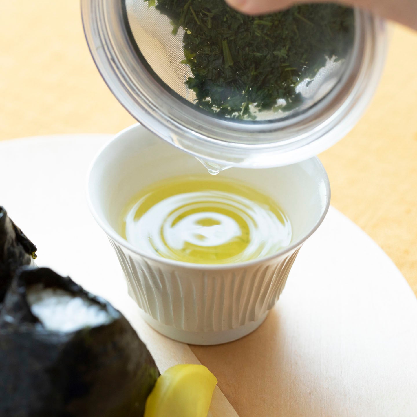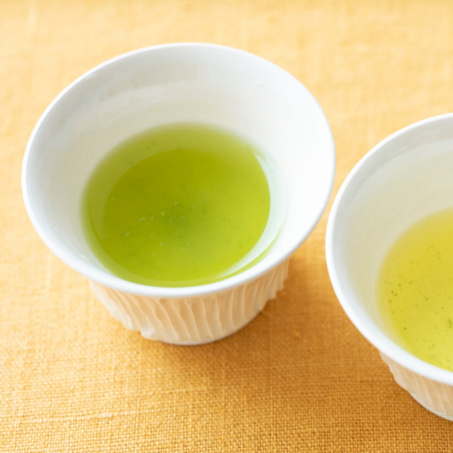 緑が綺麗に映えるしのぎカップ。やっぱり、緑が濃く出る深蒸し茶を選んでしまう。『027 CA278』のような濃厚な味わいのお茶を合わせてみてください。
