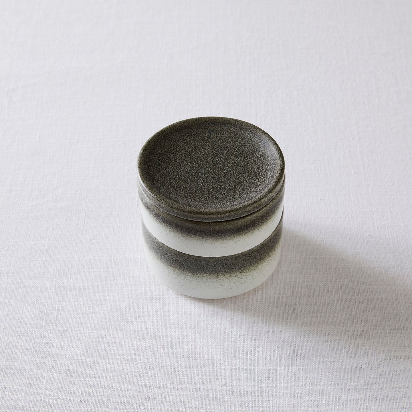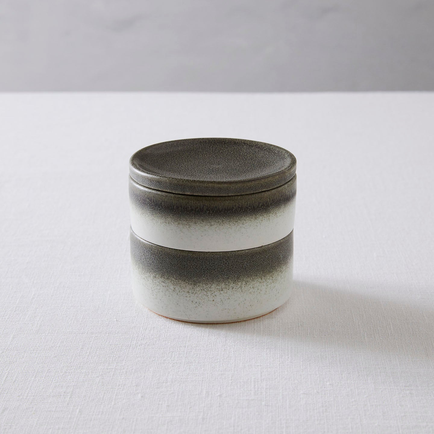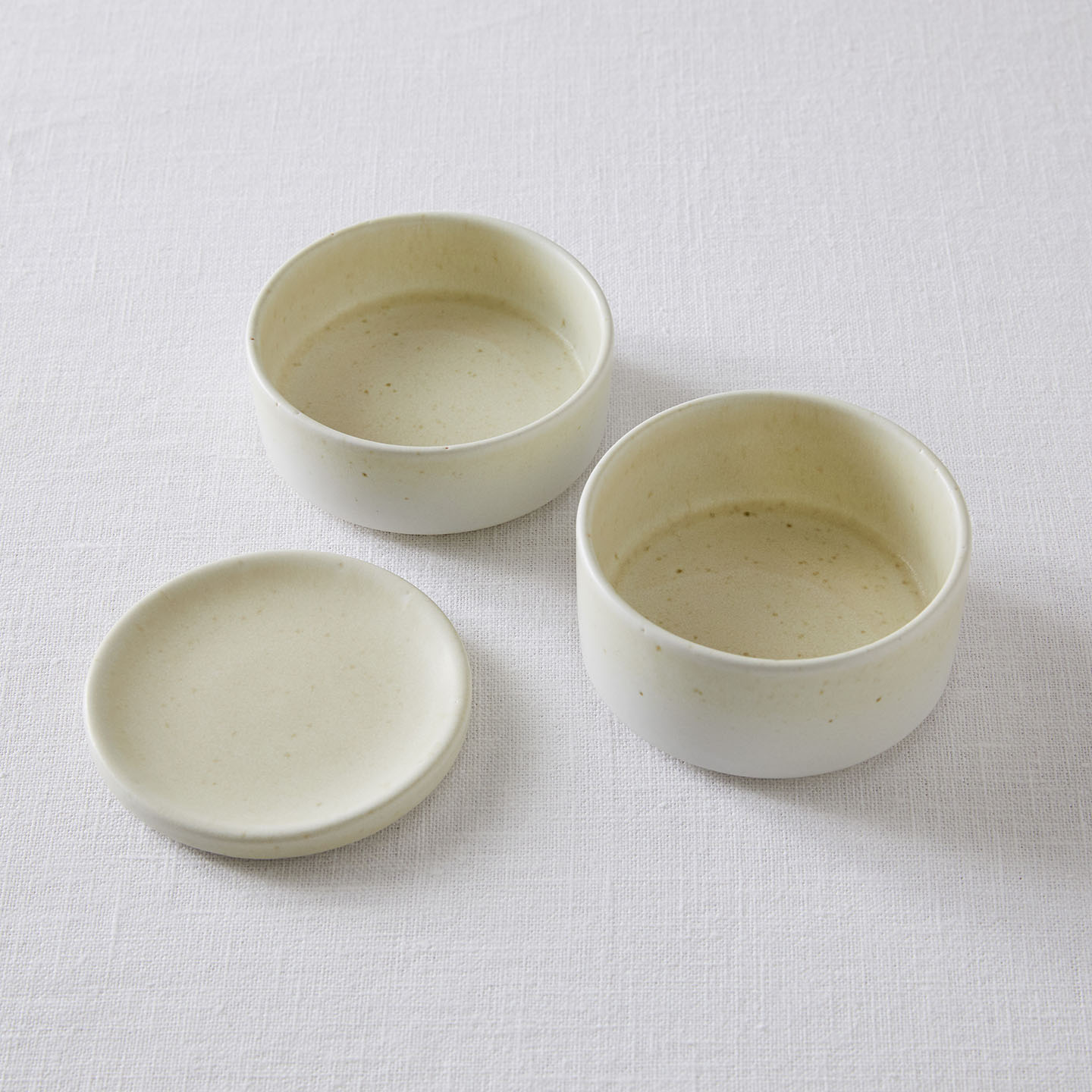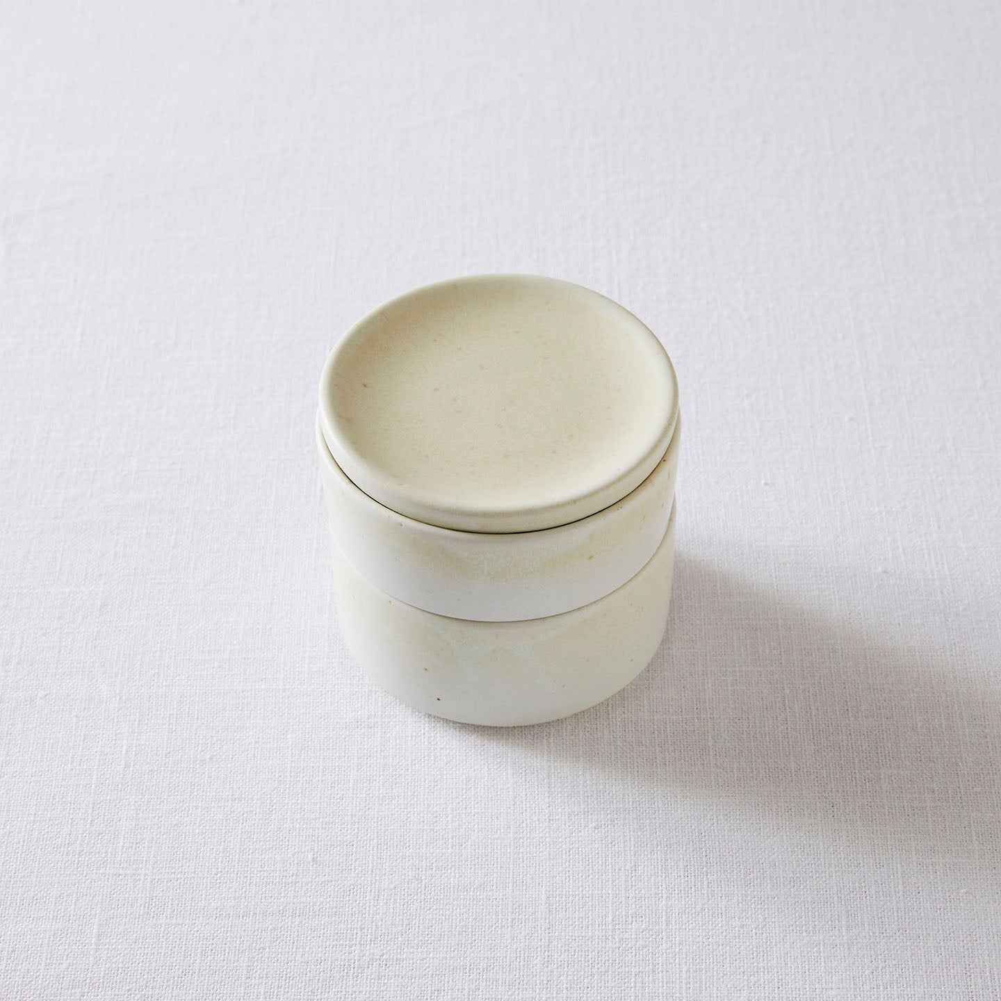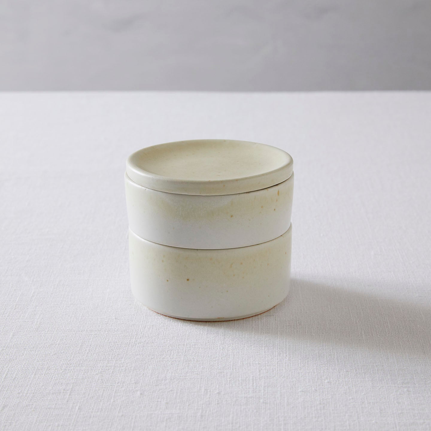 陶器で出来た“お重”。円柱のお皿が2枚と1枚のお皿がぴったり重なってセットになったこちら。