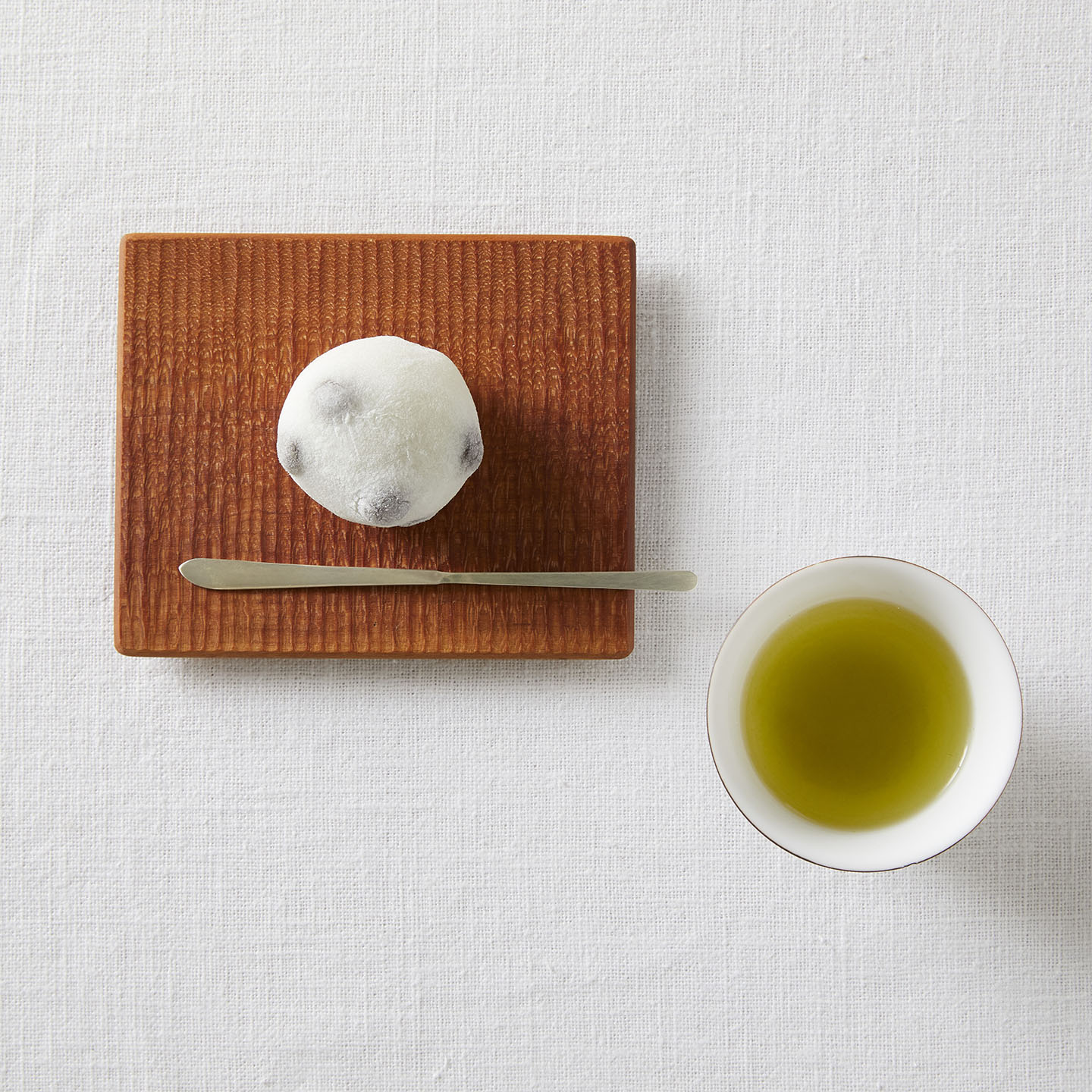 フードスタイリスト・鈴木愛さんが用意してくれたのは、豆大福。おいしい豆大福は、そのままかじりつくのも幸せです。でも、こんなに切れ味のいい菓子切りがあるのだからぜひ割って食べてほしい。