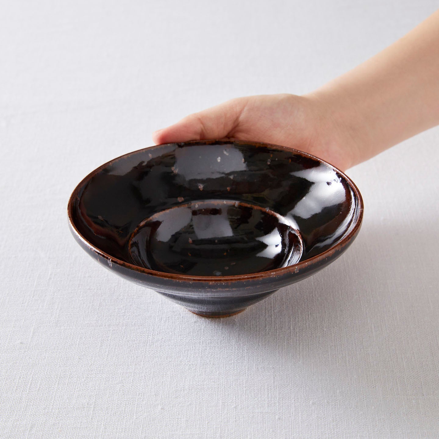 ネーミングが愛らしい「ポッコリボウル」は、まるで帽子をひっくり返したようなシルエット。今回中里さんにご用意いただいたのは、「ウズラ」と「飴釉」の二色です。