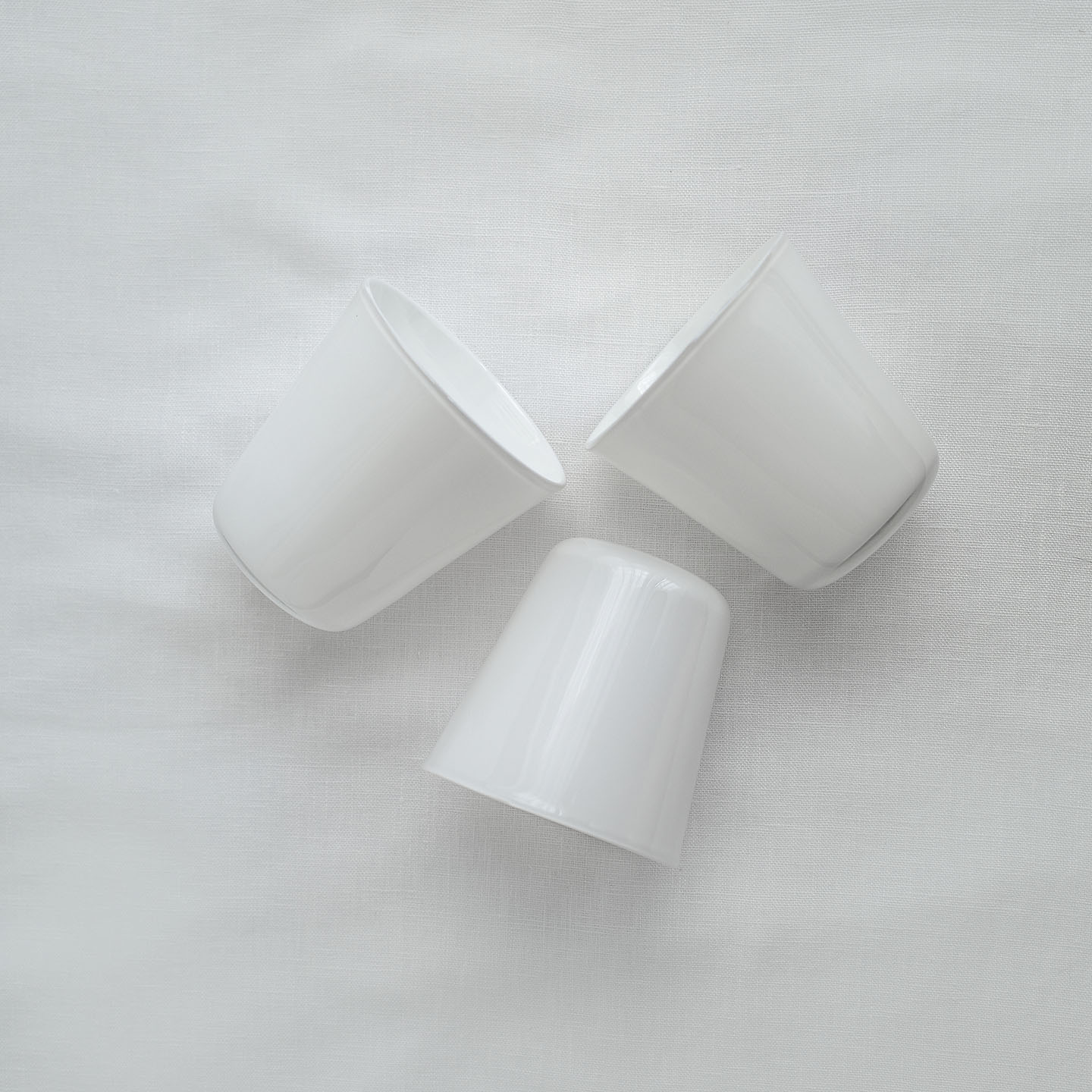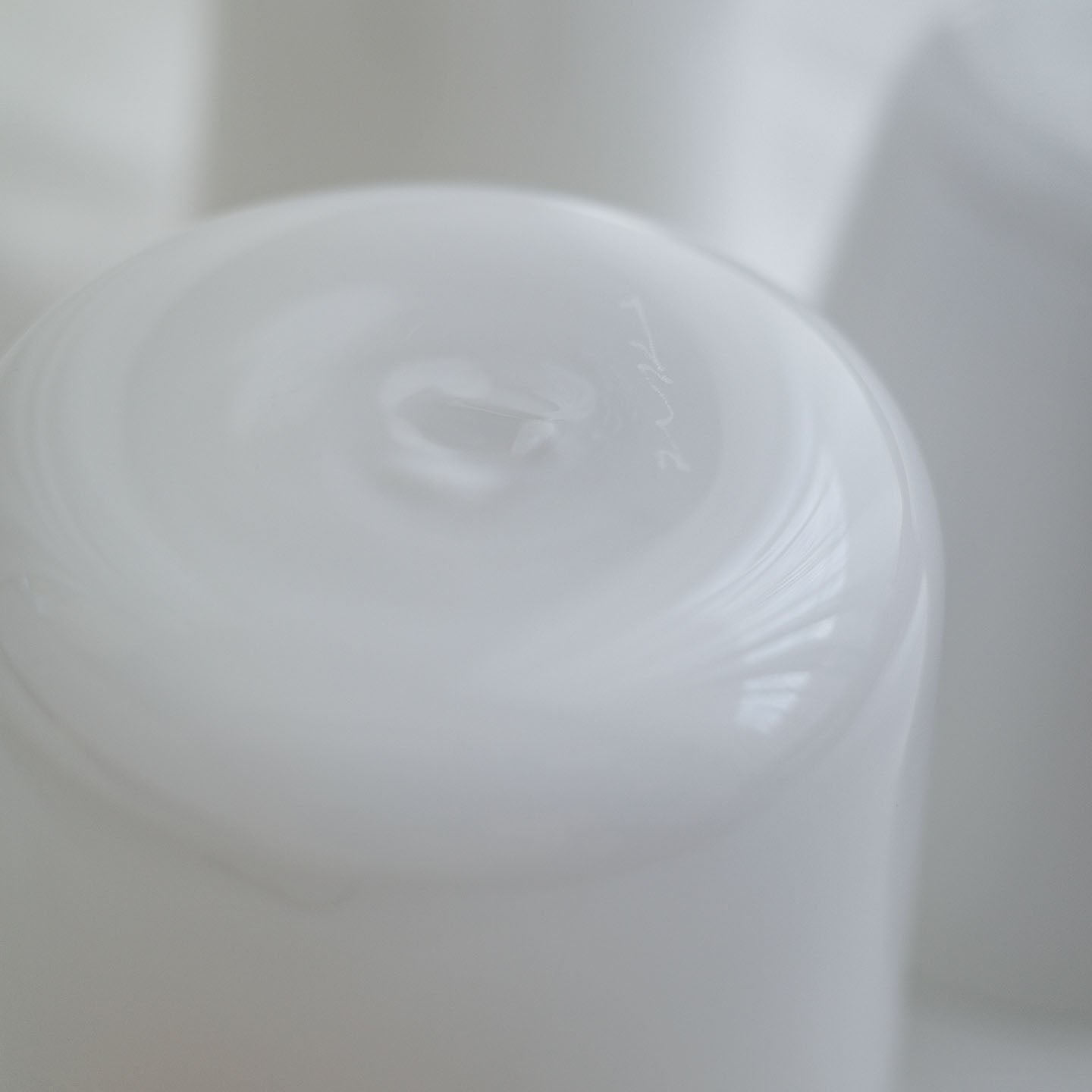 ハッとするほど純白のグラス。こんなにも美しいグラスはなかなか出会えません。よく見るとグラスの内側が真っ白く、外側にガラスの層があります。これは、飲み物の水色を鮮やかに映し出すということ。