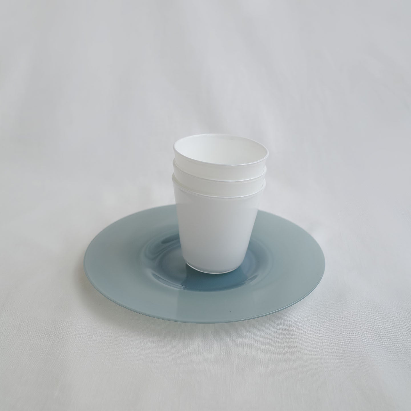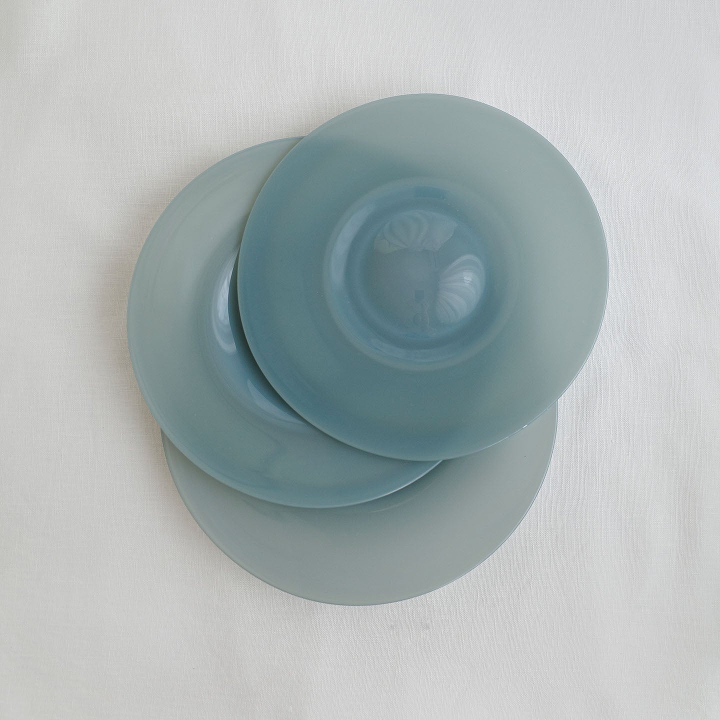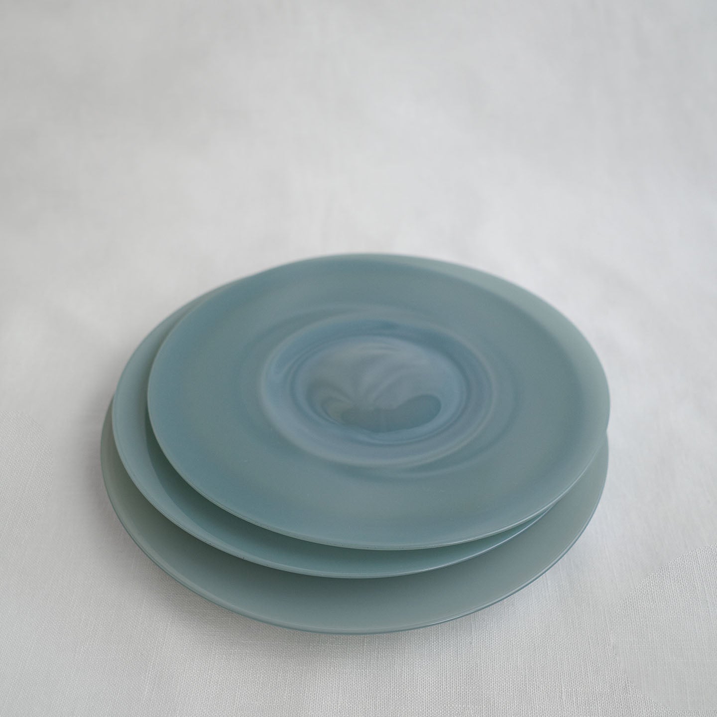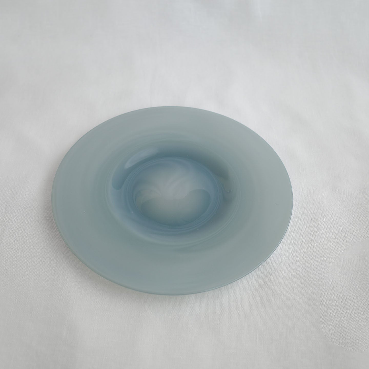 「ピジョングレー」のガラスを使用したブルーベースのプレート。は光りに透かすと印象がガラッと変わります。陽の光で見てみると名前の通りグレーの要素も。