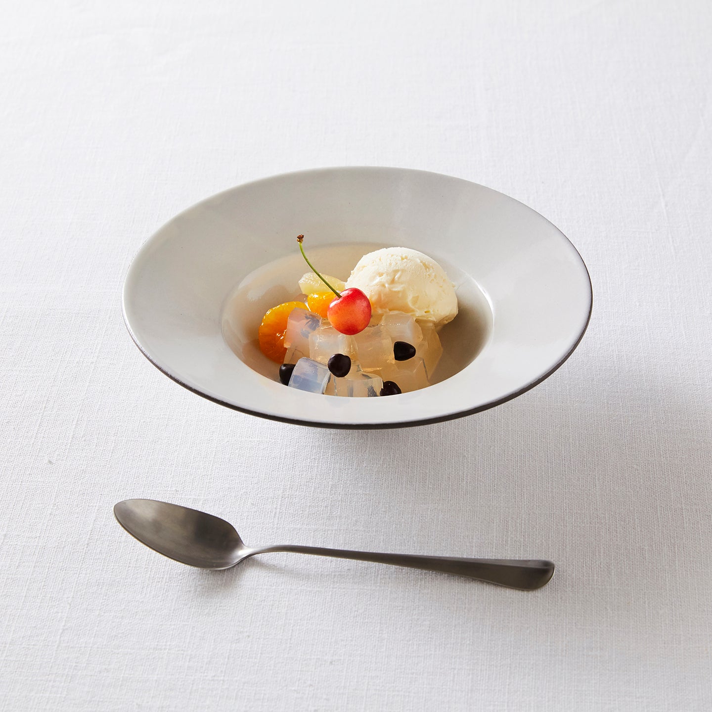 あんみつを盛り付けるとノスタルジーな可愛らしさが顔を出します。盛り付ける料理によってさまざまな表情を見せる「Rimディーププレート」。スイーツはもちろん、深さがあるので煮物やロールキャベツなどのスープがある料理でも安心です。