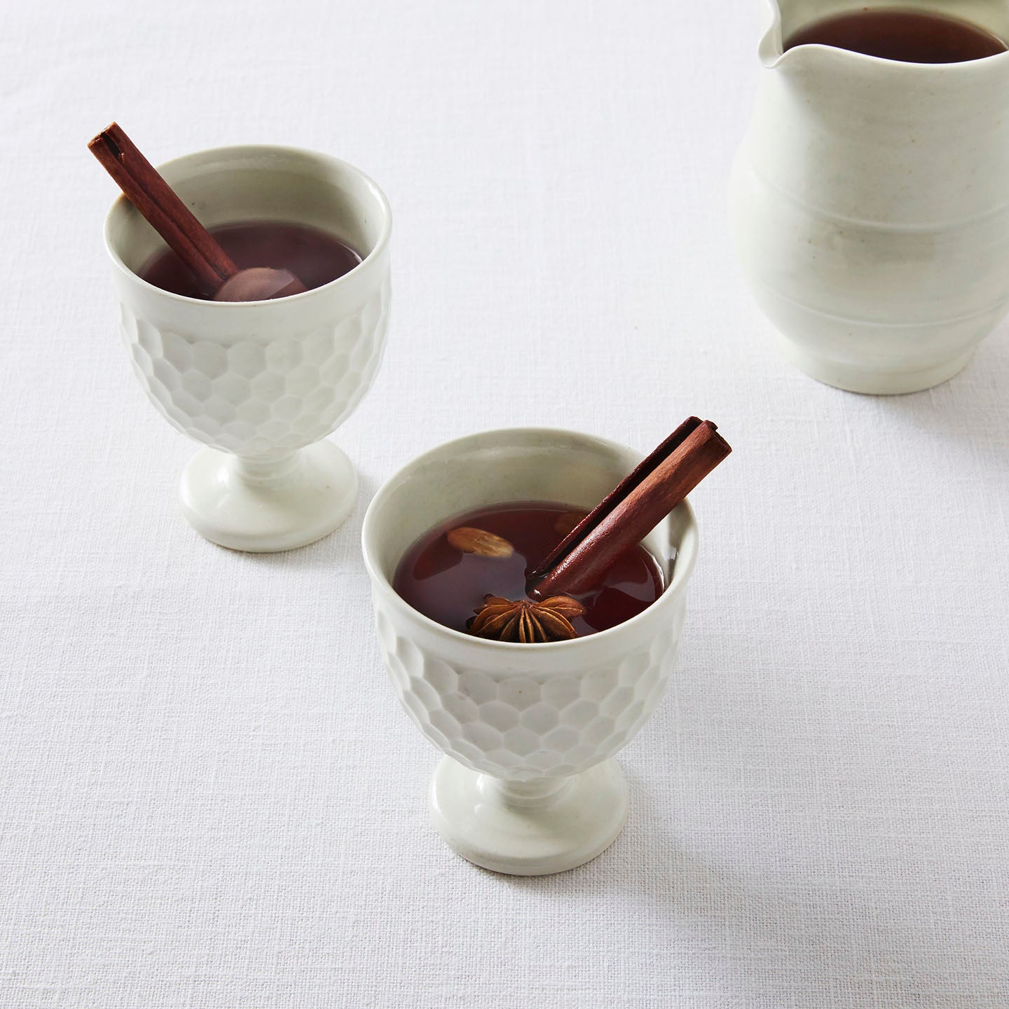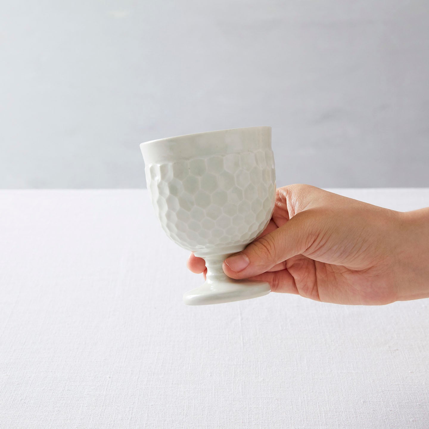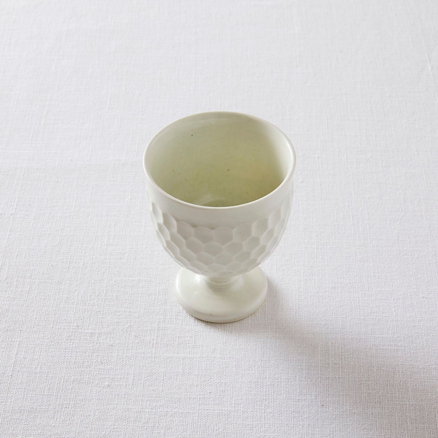 白い釉薬をまとい、凛とした静かな佇まいのこのゴブレットには、色の濃いもの飲み物がオススメです。ノンアルコールならほうじ茶にスパイスチャイ。カクテルならダークラムで作るホットバタードラムや赤ワインを使ったホットサングリアも色が映えて素敵な時間を過ごせそう。