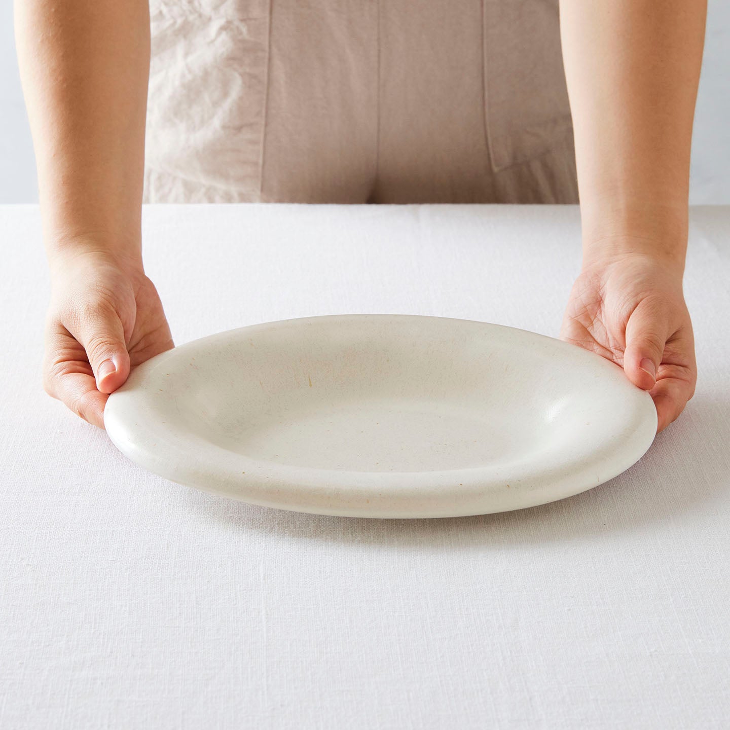 どことなく、海の雰囲気を感じる入江さんの作品。それもそものはず。「puffy oval long」は陶土に海の砂を混ぜて作っています。かもめが羽を広げて飛んでいるかのように、特徴的なカーブのリムがまた海を感じさせます。