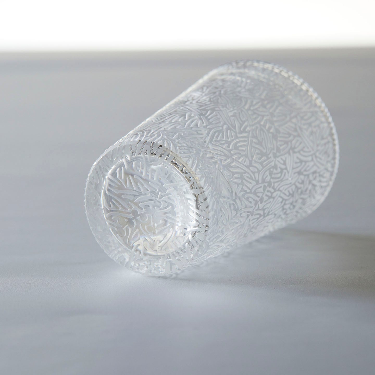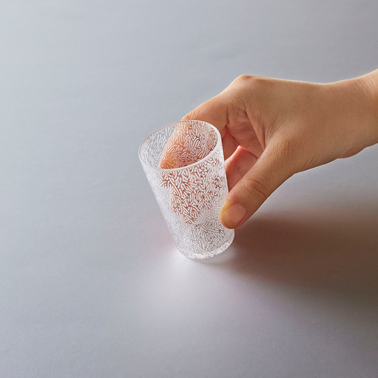 透明なグラスに木工用ボンドで下絵を書いてからサンドブラストを吹き付けて制作する三野さんの作品。緻密な作業から生まれる模様は、唯一無二の美しさです。このグラスの美しさをつまみにお酒を飲むのも良さそう。