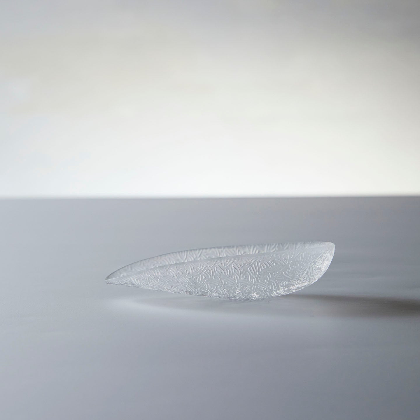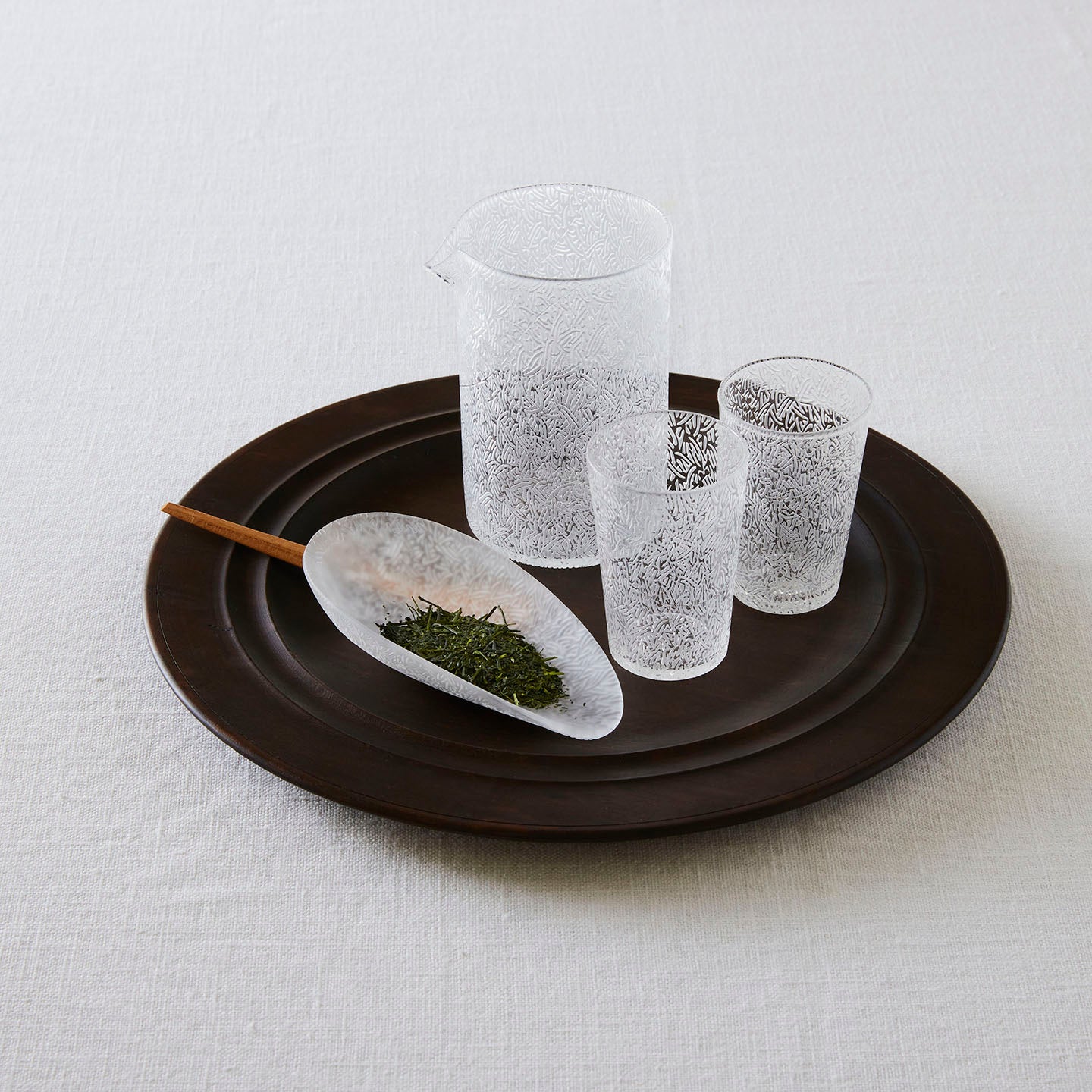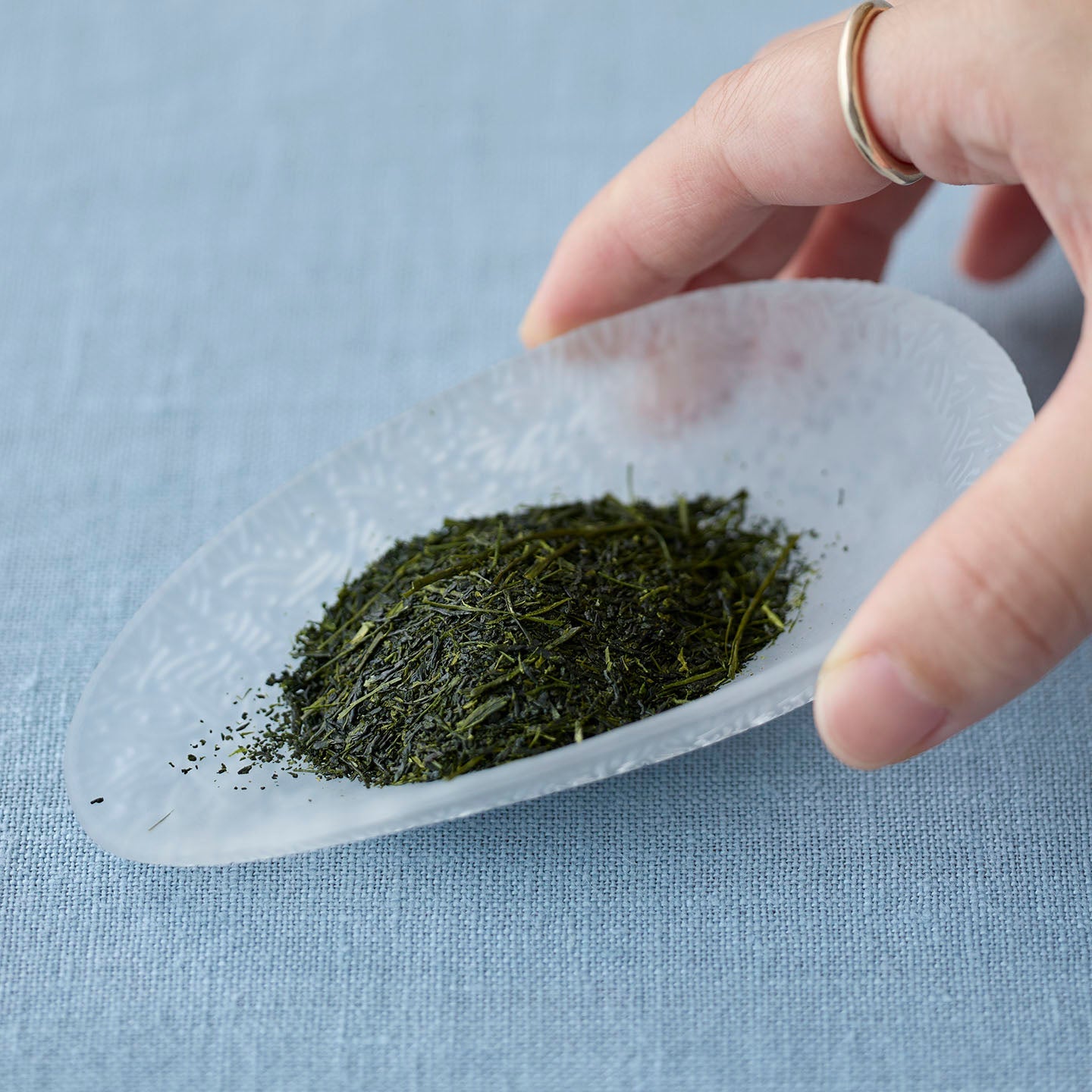 茶則に茶葉をのせると茶葉の色や針のような撚りがよく見えます。抽出されたお茶を飲むことはもちろんですが、茶葉は観察するのも楽しく、そして、指の腹で触れるとすりガラスのマットな質感が気持ちいい。