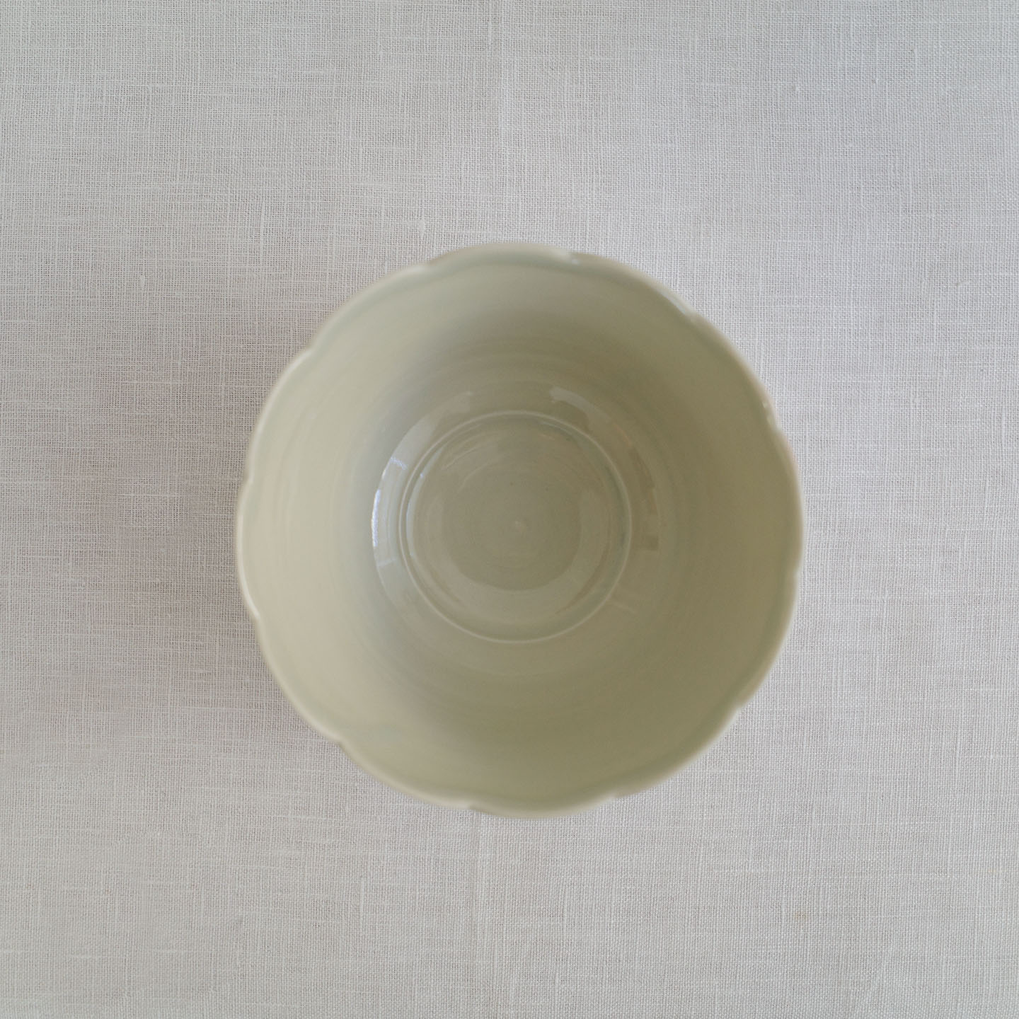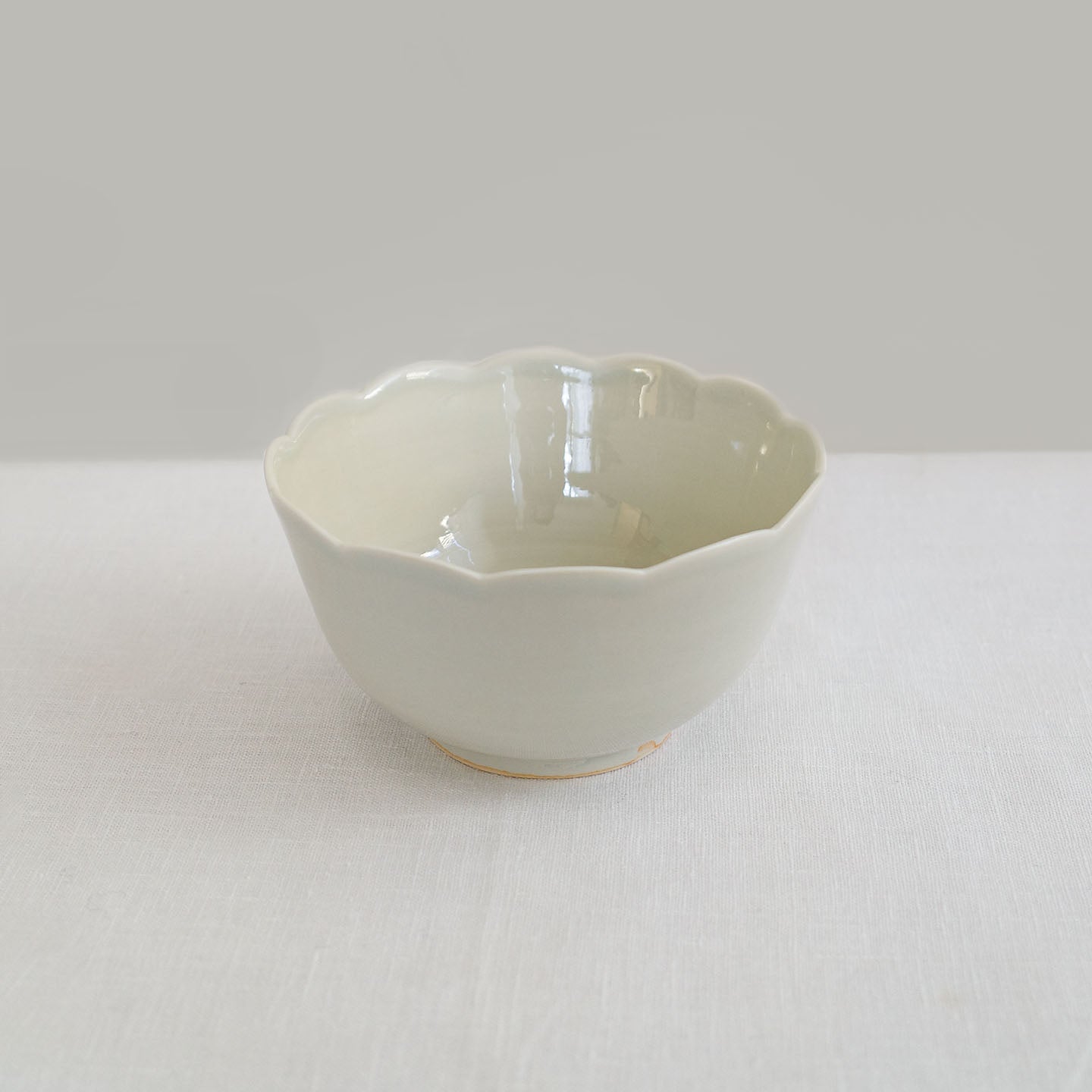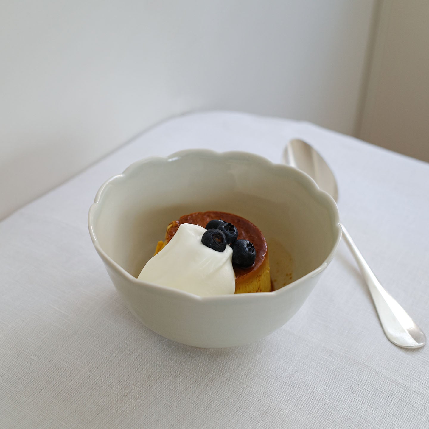 副菜やデザートを盛り付けたい、絶妙なサイズの「輪花碗」。花弁を模した縁に溜まった釉薬が目にも美しい。食器棚に収納されている様子にも、愛着が持てそうです。