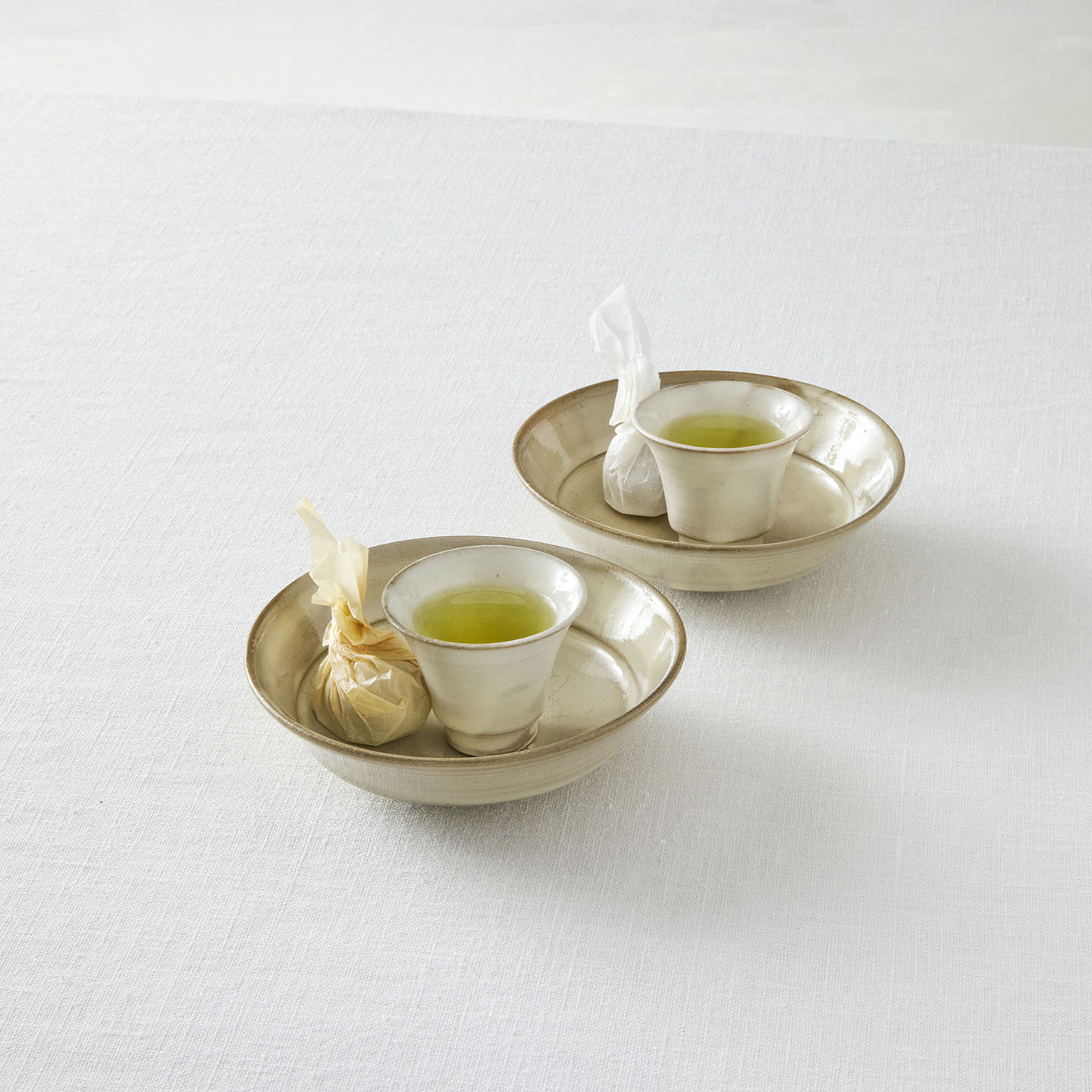 潔く、見込み部分にお菓子をひとつ。同系色の素朴なお茶菓子も、こんなに素敵に見えるのは器のもつ力にありますね。(一緒に合わせた茶杯も先ほどご紹介した荒賀さんの作品です)