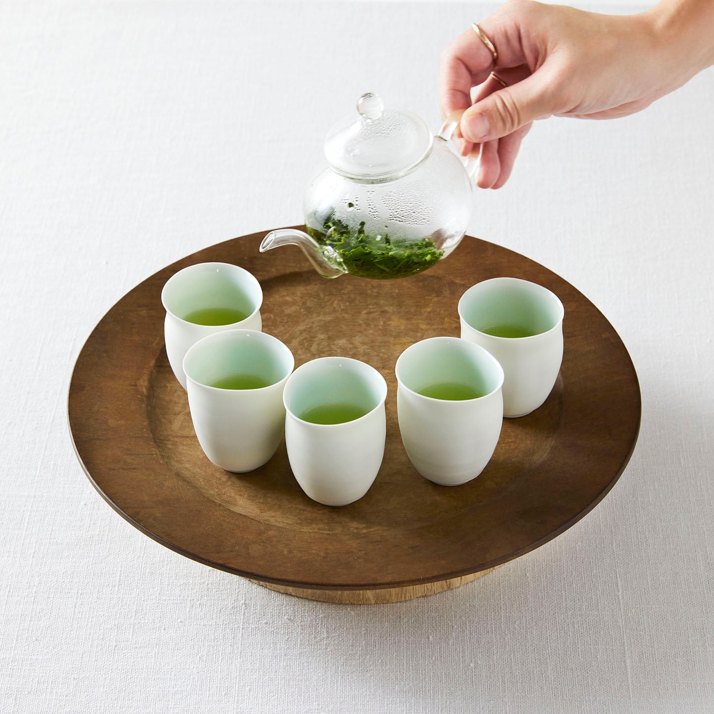 飲み口が薄く、涼しげな印象のある村田さんの茶杯には、ガラスの茶器も合います。お茶を用意するときの道具の合わせ方も含めて、幅が広がりそうです。