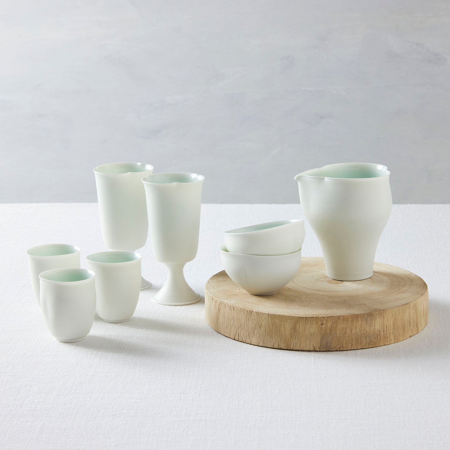 自然豊かな京都府山科の工房で制作を行う村田匠也(むらた・たくや)さん。伝統の京焼を幼い頃から側で見ていた村田さんが解釈する茶の道具は、静かで瑞々しい。お茶の色を美しく見せる青白磁の肌の色や、使い手の所作を美しくする形にも注目していただきたいと思います。