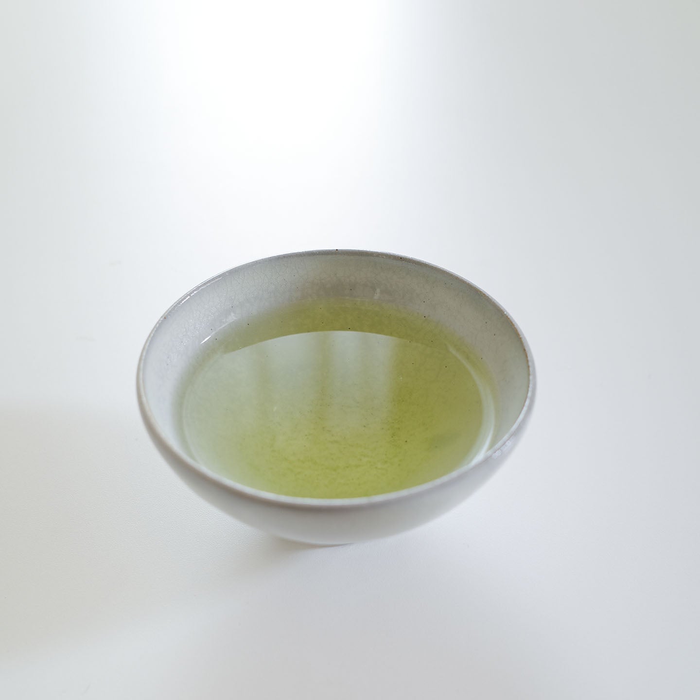 「平型」は、お茶の美しい水色を眺めるのに最適です。古谷さんの作る釉薬はニュートラルな白〜やや青みがかった白なので、緑茶を注ぐのにはもってこい。