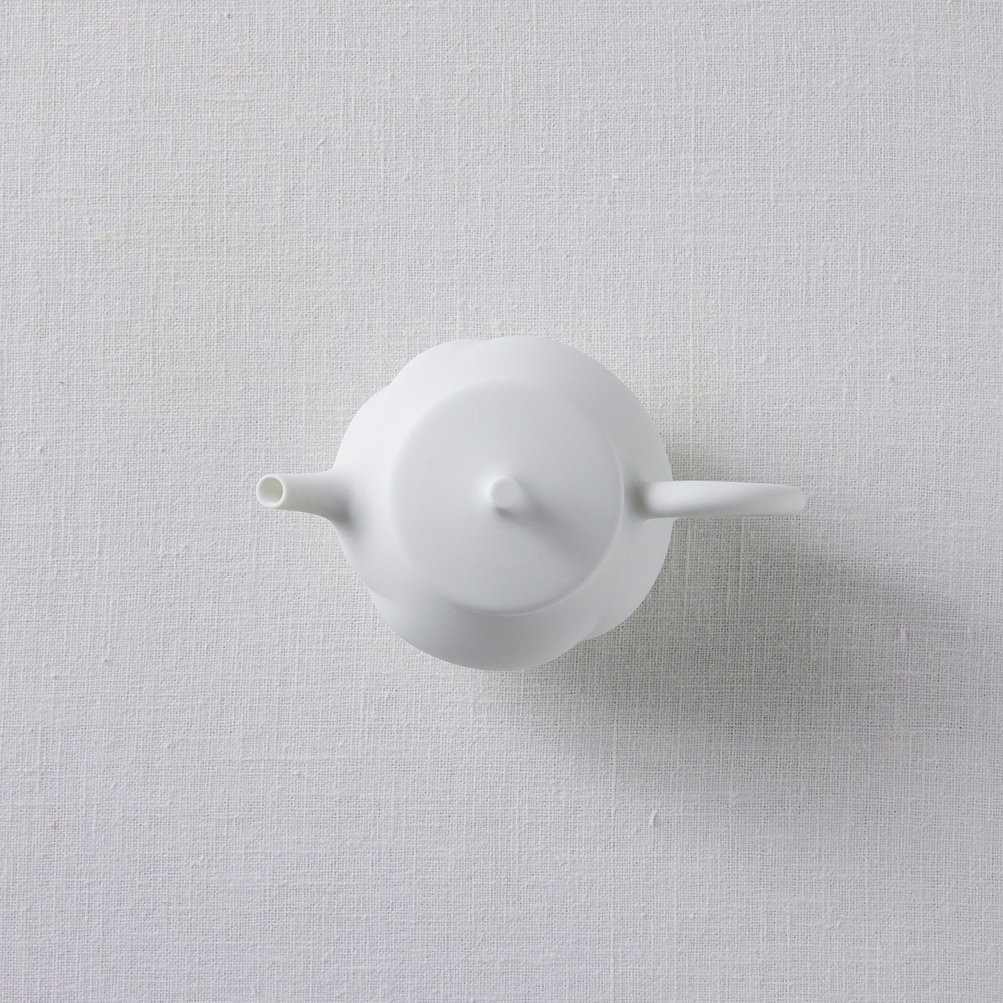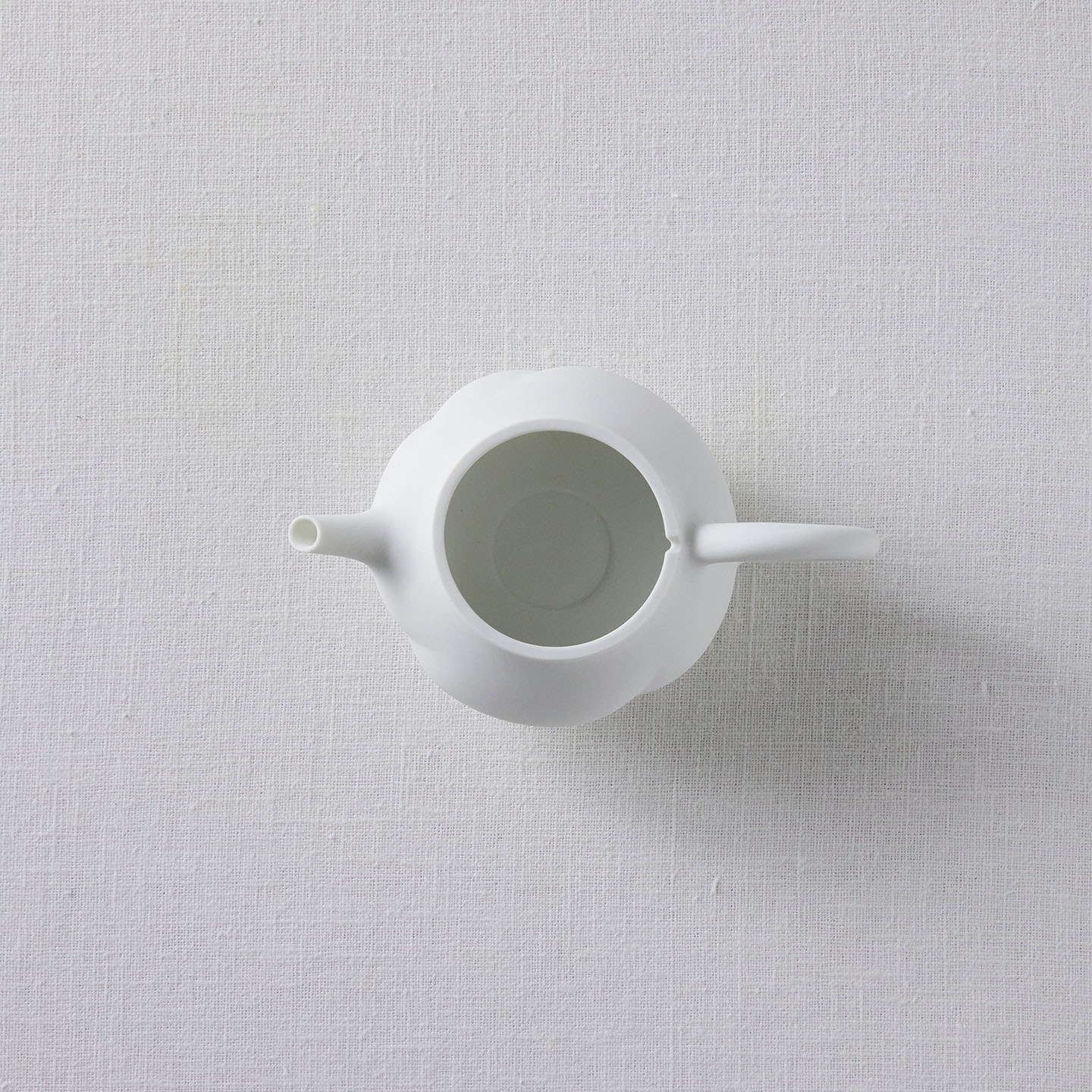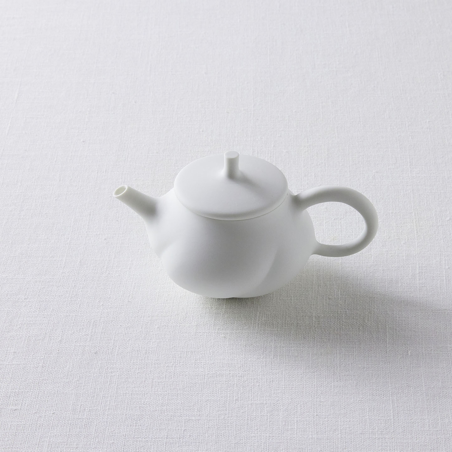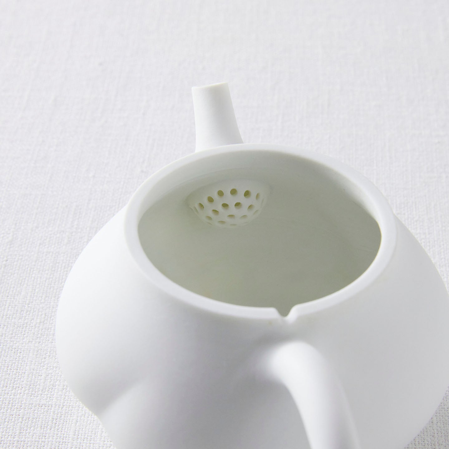 白磁をマットな質感に仕上げ、急須の表面はねじったような存在感のあるデザインに。右手でサービスする際、お客さま側にスパイラル模様がよく見えるようにできています。