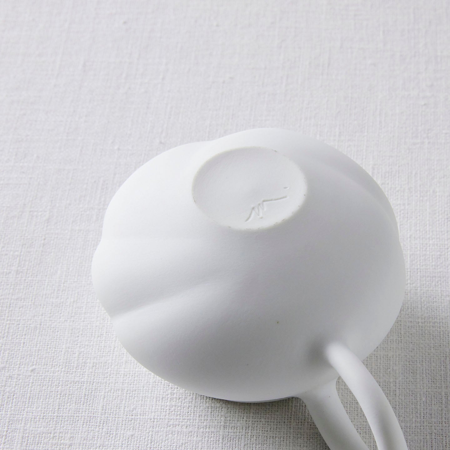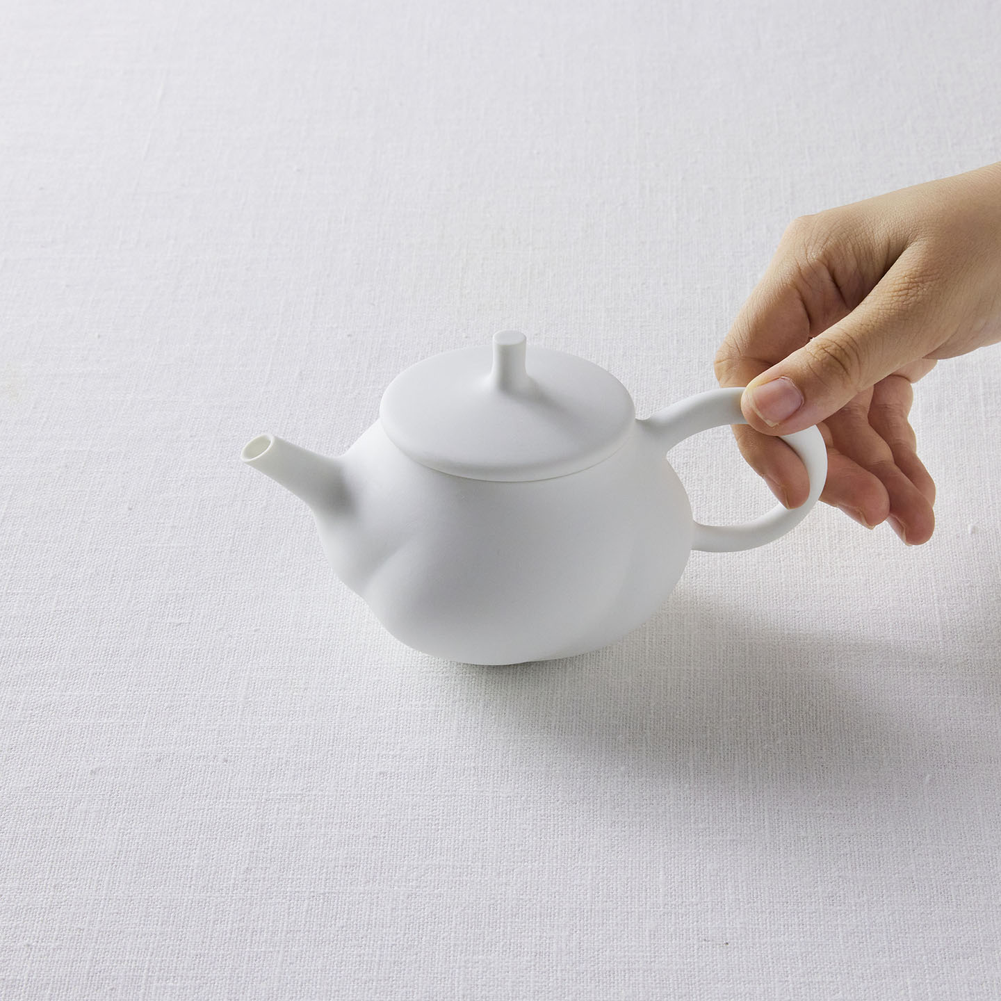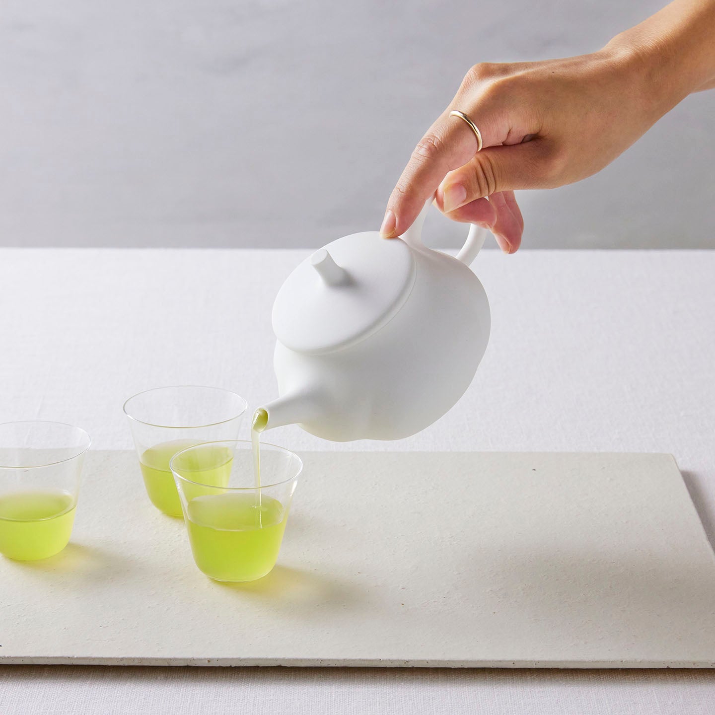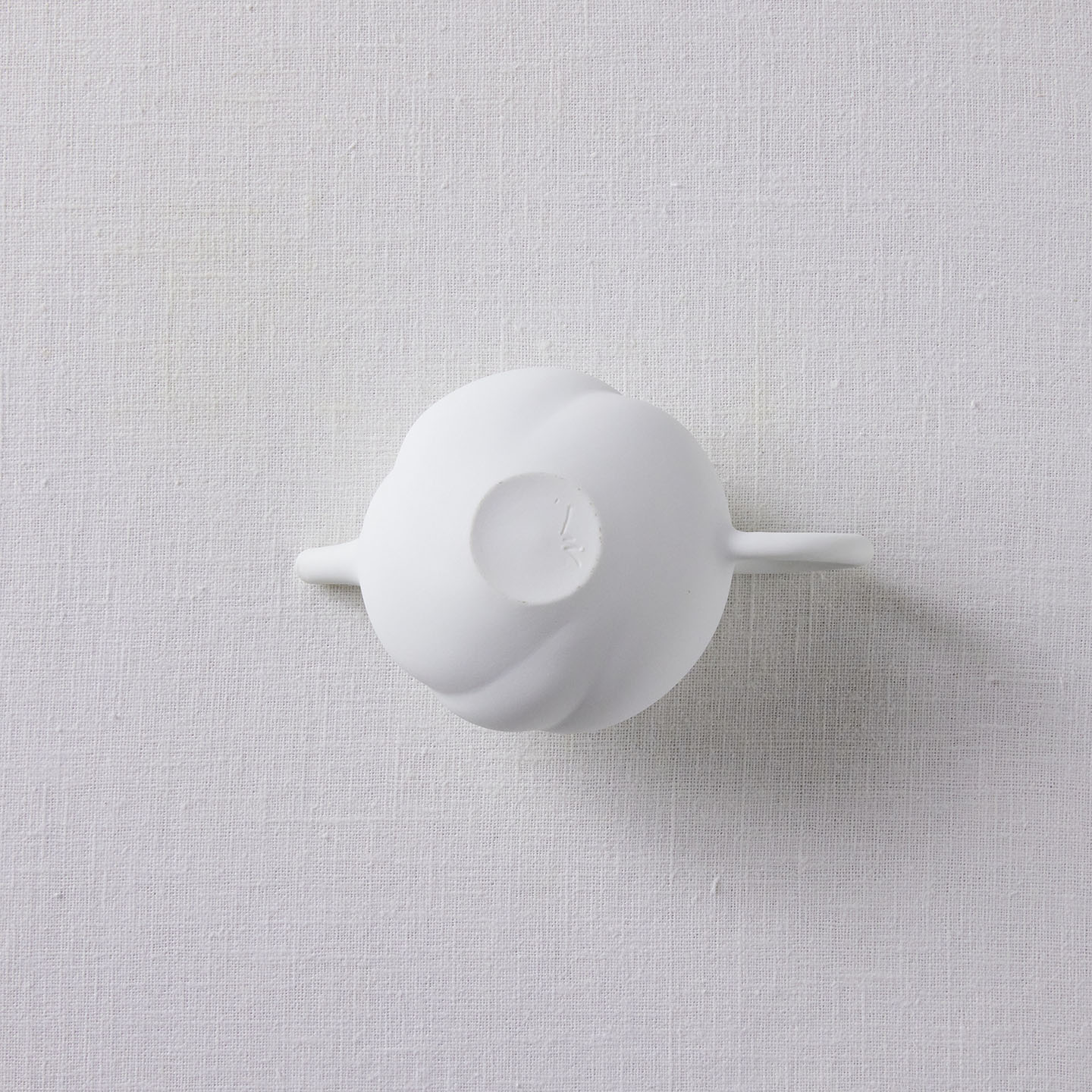 白磁をマットな質感に仕上げ、急須の表面はねじったような存在感のあるデザインに。右手でサービスする際、お客さま側にスパイラル模様がよく見えるようにできています。