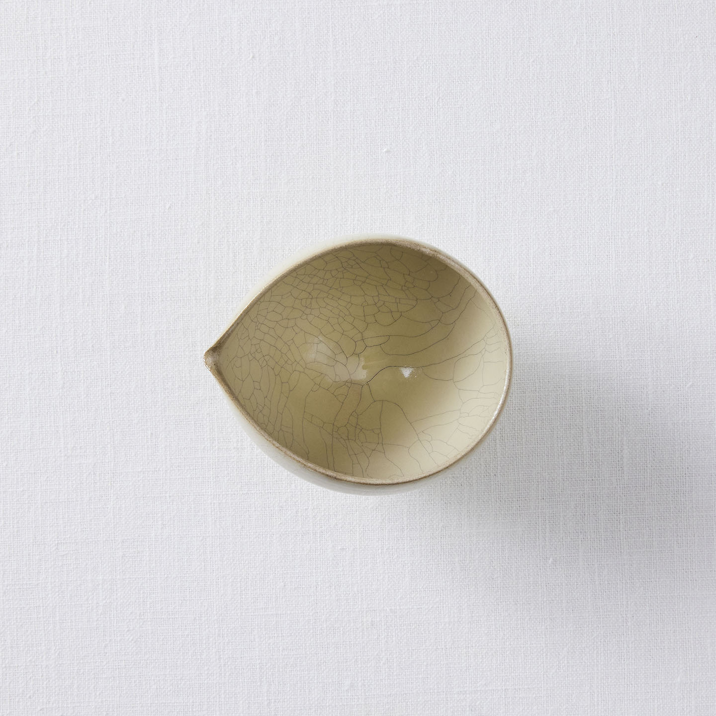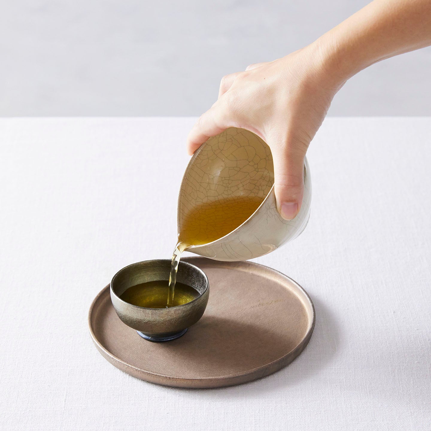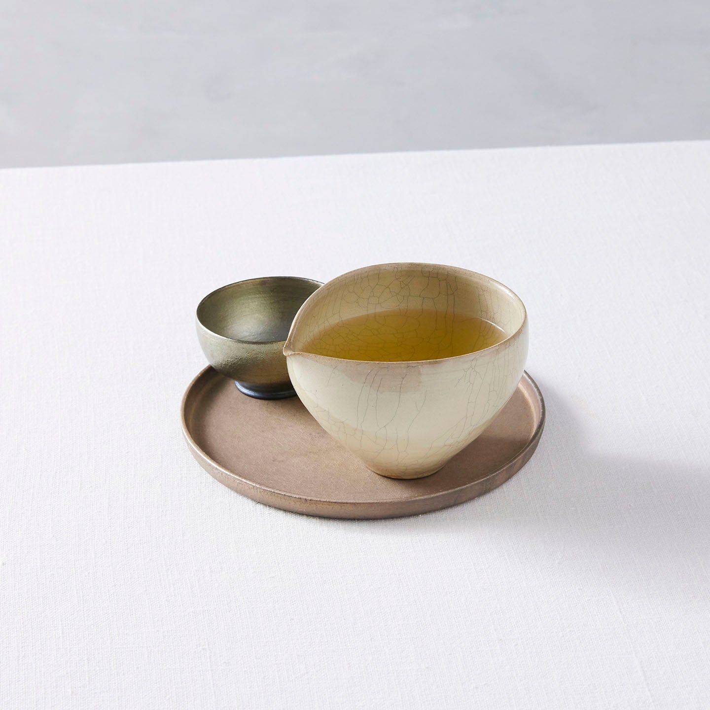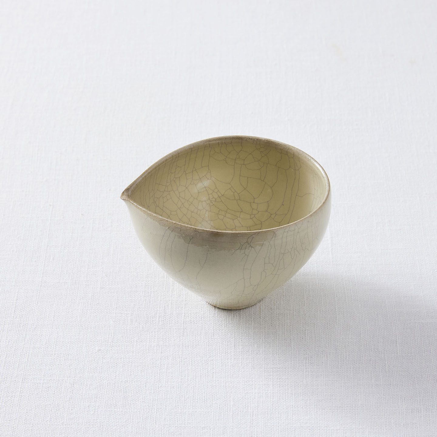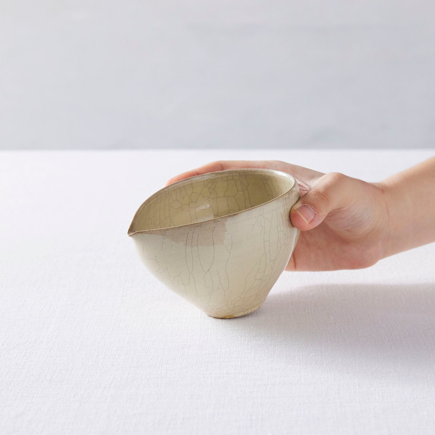 ひび割れた釉薬の表情が魅力の「ヒビ粉引き片口」です。濃い水色のお茶や、日本酒、抹茶にもおすすめです。