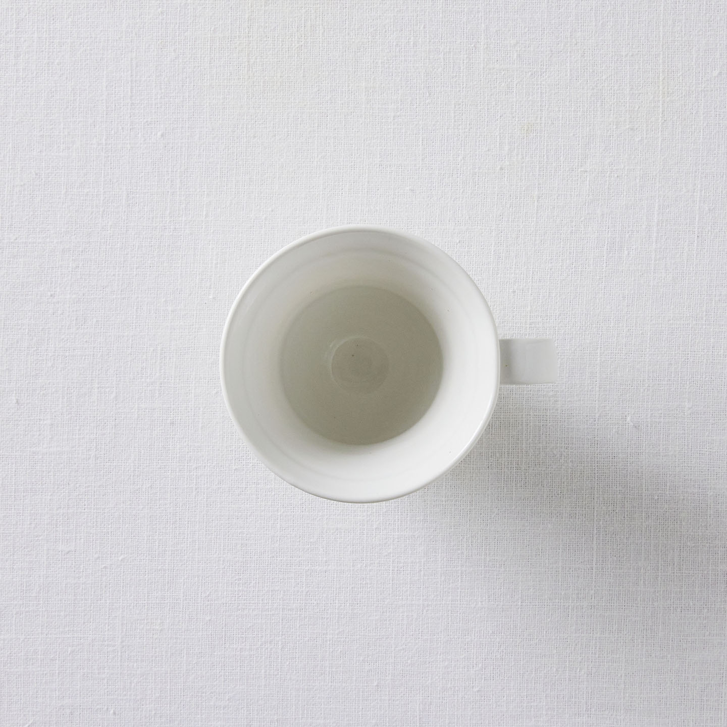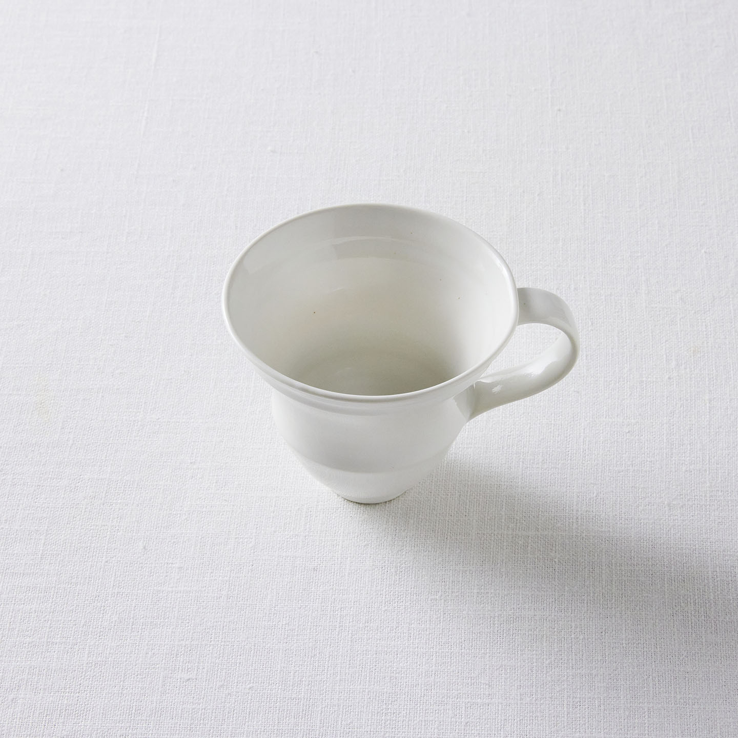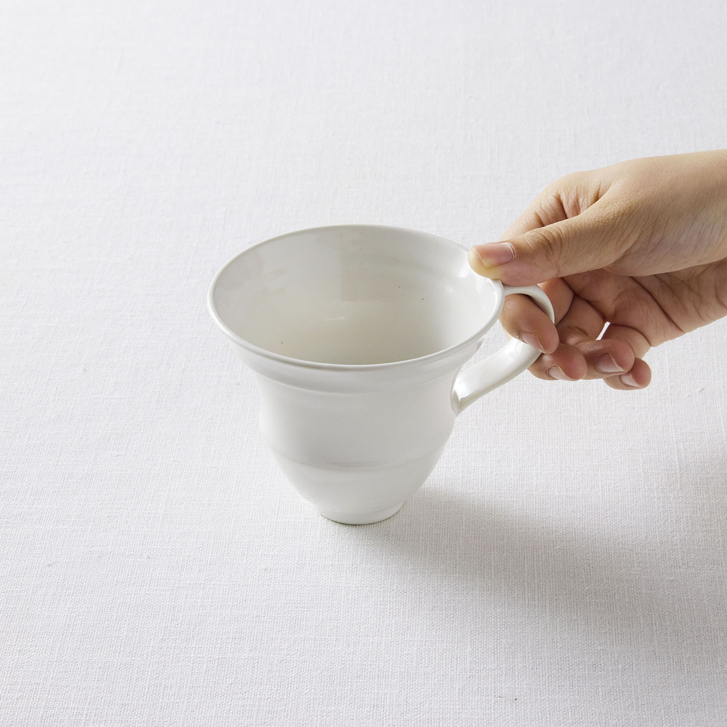 つややかな白い釉薬をまとった「カップ」です。ヨーロッパのアンティークカップのような上品さがありながら、たっぷり入る容量で実用性もあり。