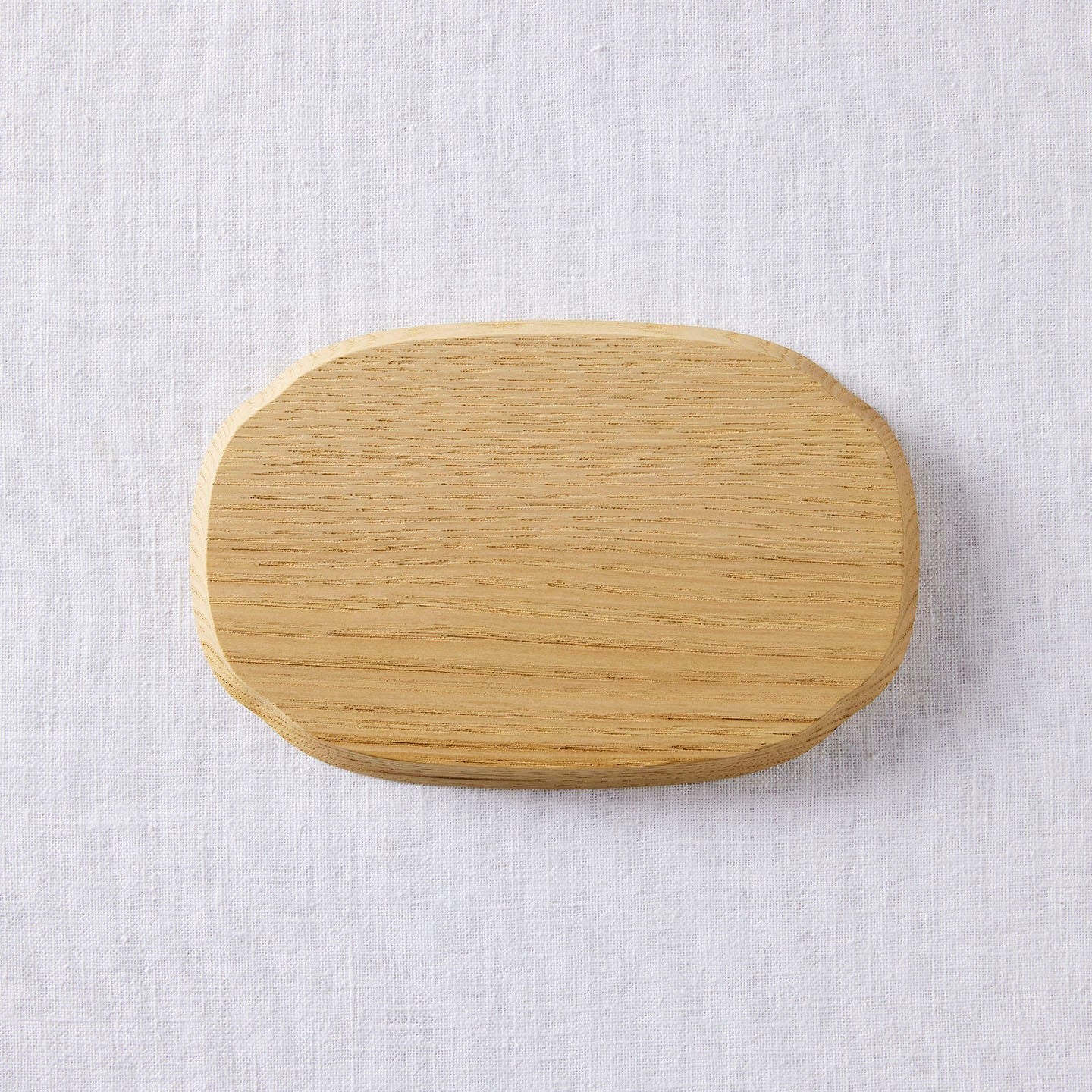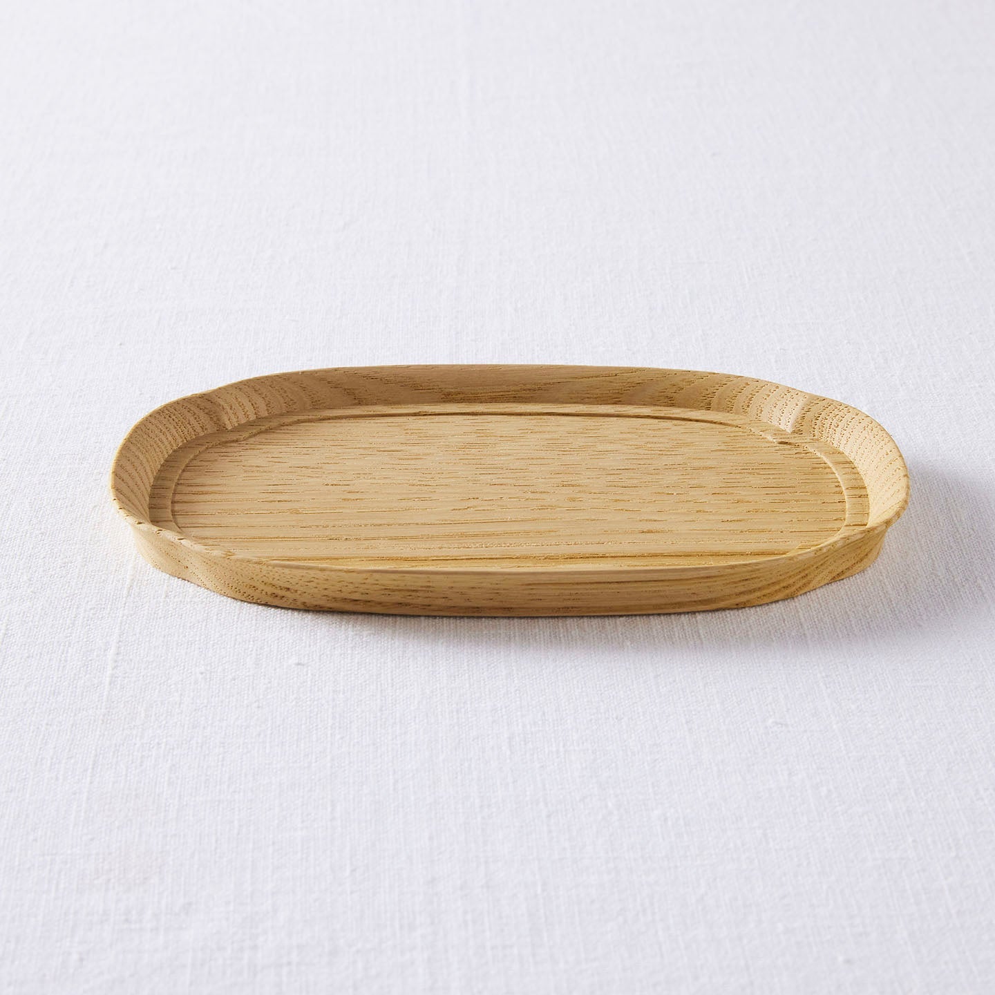 温かみのあるクリの木の木目が美しい「長木瓜(ながもっこう)盆」。長さ21cmほどで、横長のシルエットが特徴のお盆です。