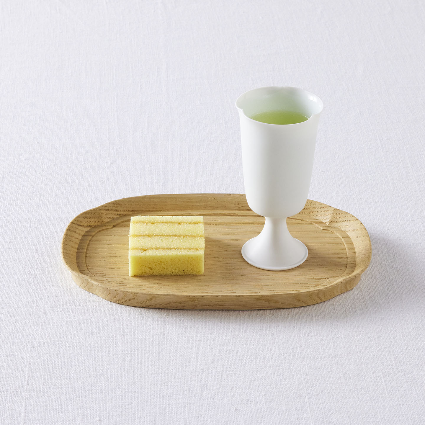 お気に入りの急須と湯呑みを横一列に並べた姿は、このお盆ならではの愛らしさ。家紋などで知られる木瓜型をベースにしたデザインは、正統派クラシックな印象も受けます。