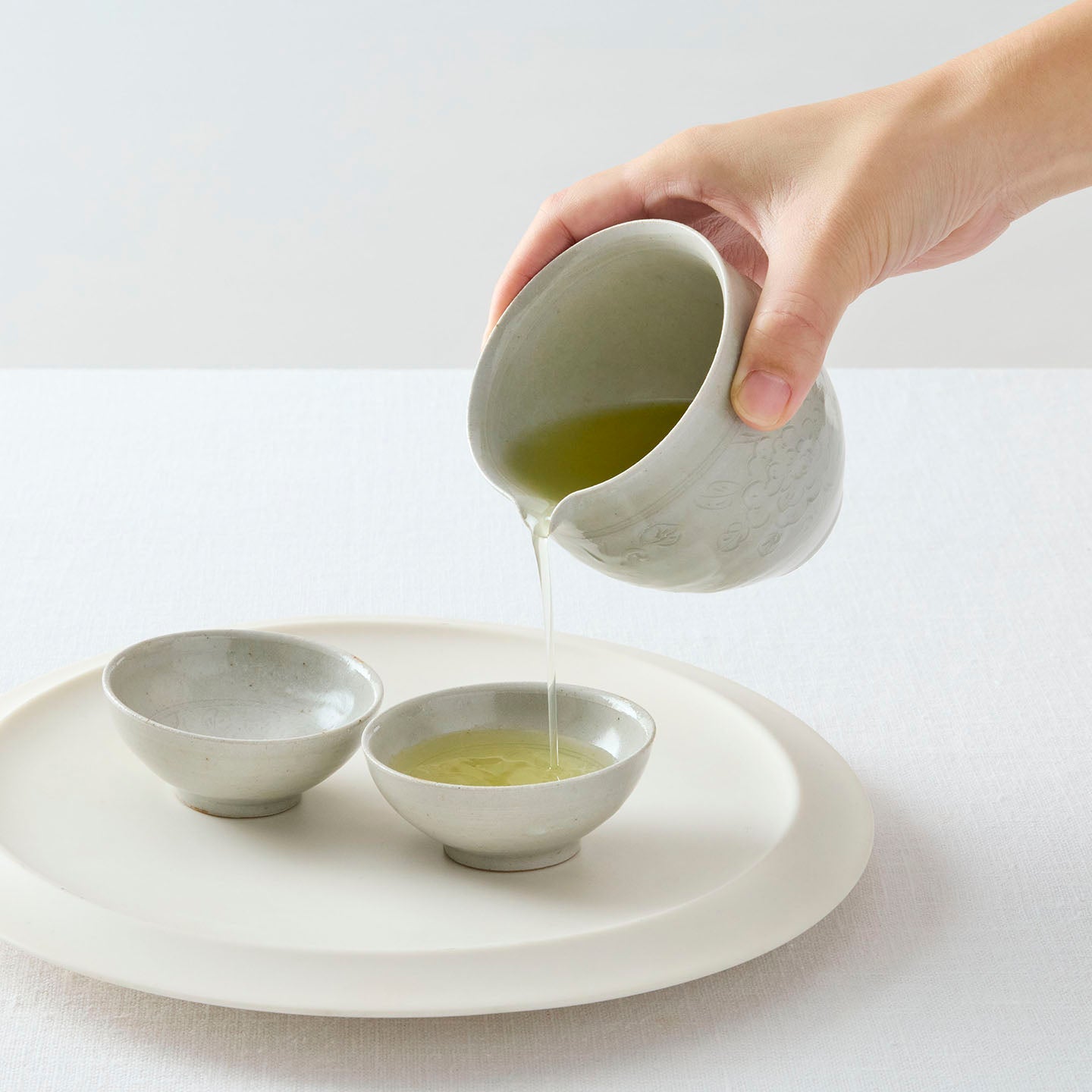 いれたお茶を一旦移すために使う中国茶の道具「牡丹唐草白釉茶海」も、あるとお茶の楽しみ方が広がります。ピッチャーとして使ったり、料理のシーンで合わせたりと、自由な発想でお楽しみください。